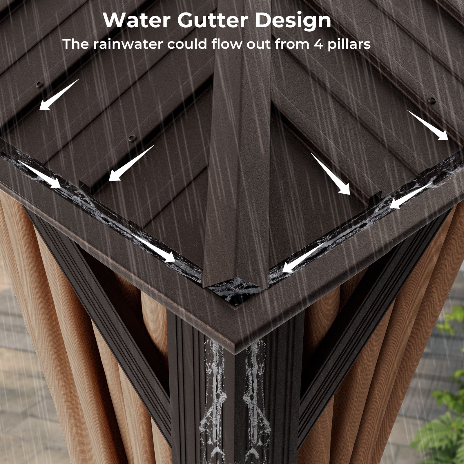 ● All-Weather Galvanized Steel Roof: The hardtop gazebo adopts a heavy-duty galvanized steel roof which can reduce 99% harmful sunlight on sunny days withstand heavy rain and wind (up to 30 MPH) on rainy days and withstand heavy snow load of 1760 lbs on snowy days. Moreover it features a water gutter design therefore the rainwater could flow out from 4 pillars.
