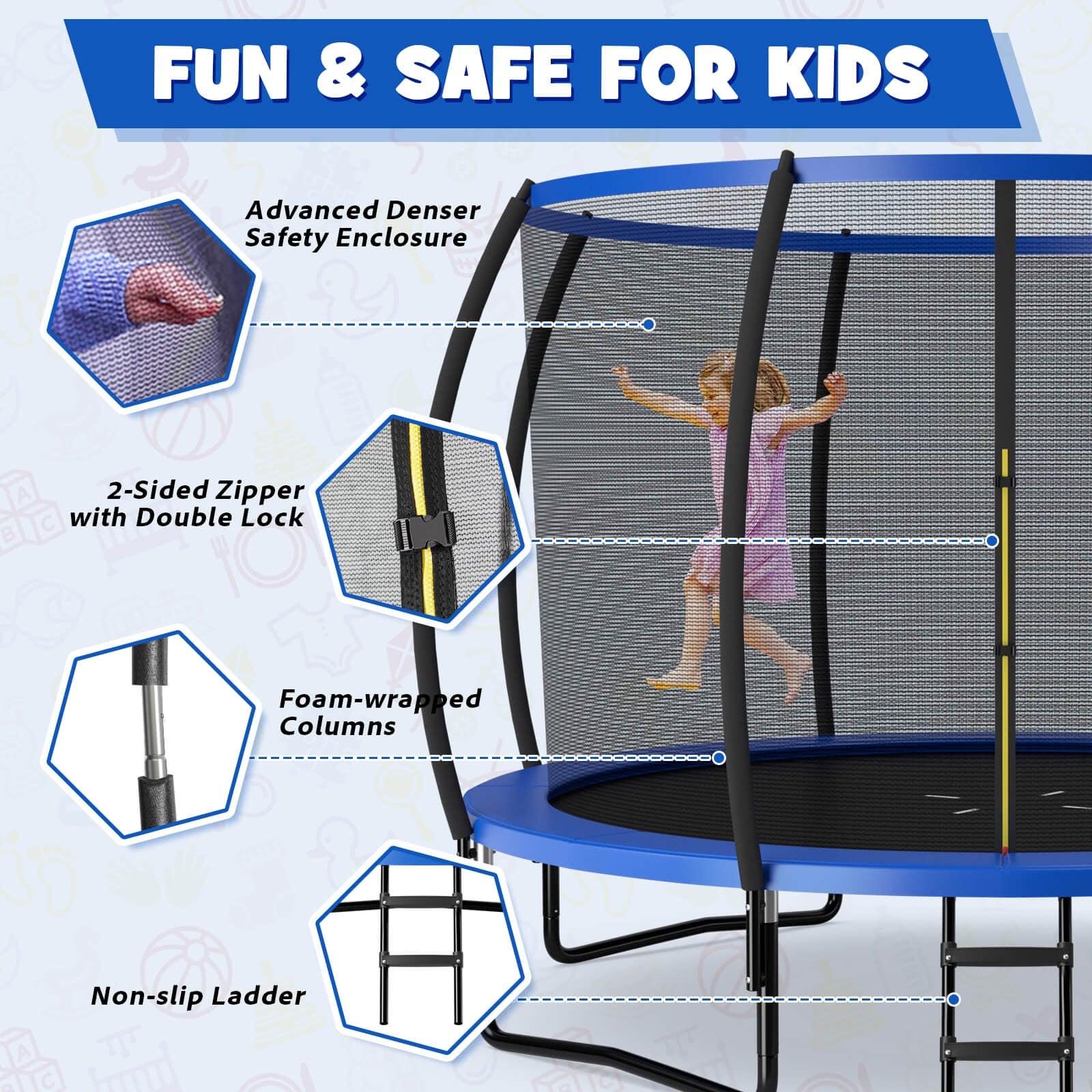 ● Comprehensive Safety Protection: This trampoline features curved poles designed to protect kids from getting injured  and the 10 mm foam cover can reduce the impact if kids hit the poles. The safety pad covers up the spring in case of stepping on them. Even our 8ft trampoline is equipped a ladder with is built with 2 wide and non-slip steps.