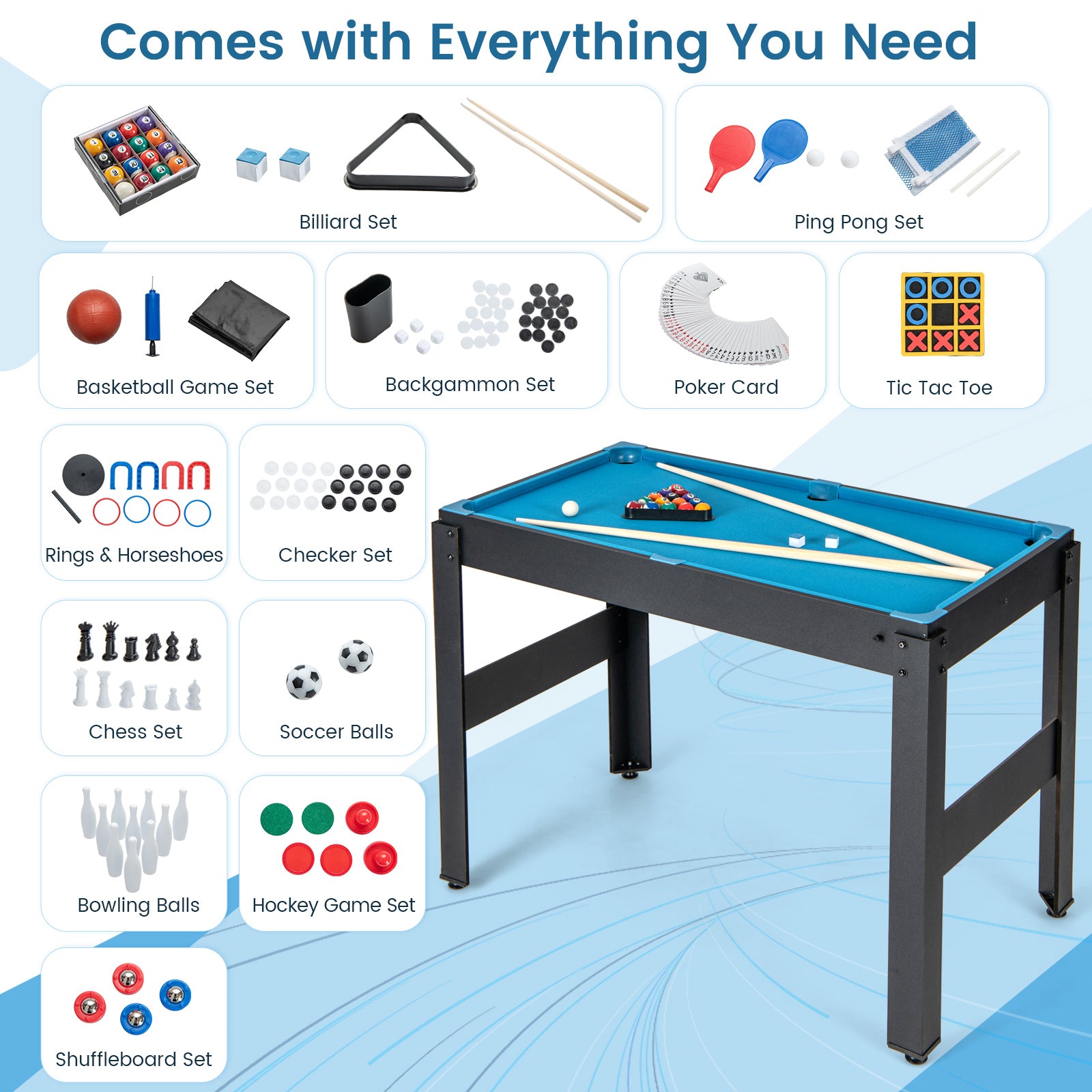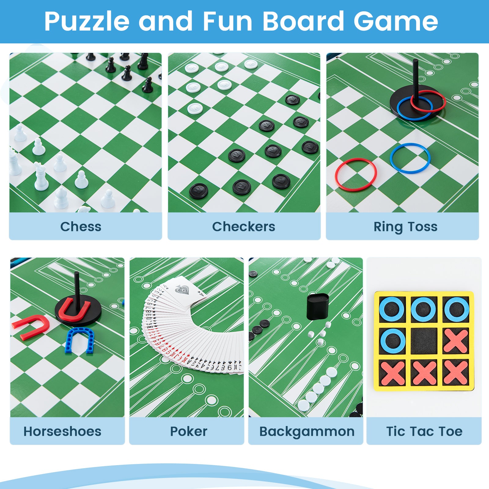 ● 14 in 1 Game Table Set: Featuring 7 exciting ball games 5 board game and 2 toss game including foosball hockey billiards table tennis bowling shuffleboard chess backgammon checkers poker and dice ring toss horseshoes basketball and tic tac toe. This 14 in 1 game table set will surely offer you endless fun.