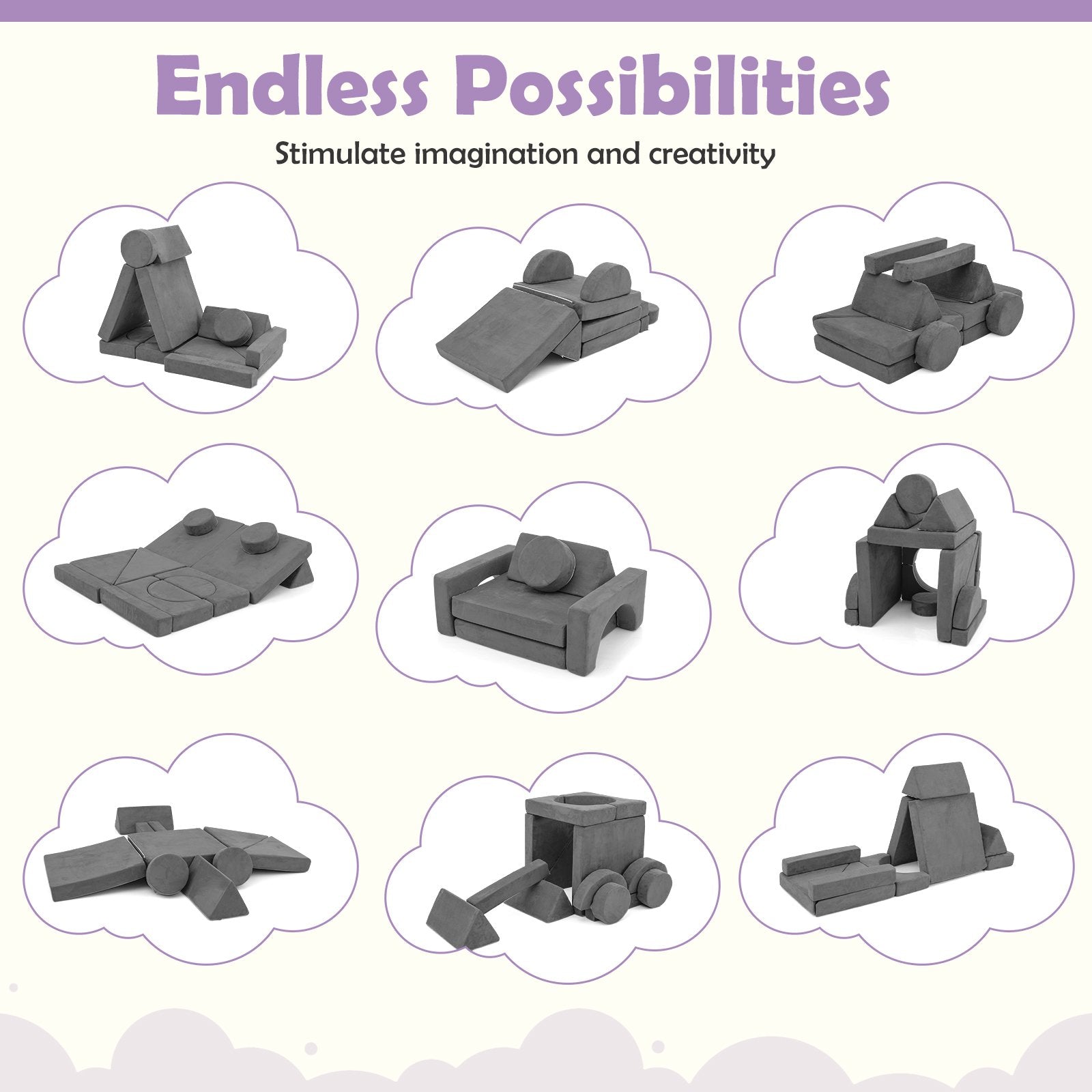 ● Endless Possibilities: Coming with foam blocks in different shapes this 14 pcs modular kids play couch ignites your child's imagination and creativity which can be reconfigured into forts tunnels or lounging spots. This multi-purpose furniture offers endless possibilities for inventive play aiding in cognitive and imaginative development.
