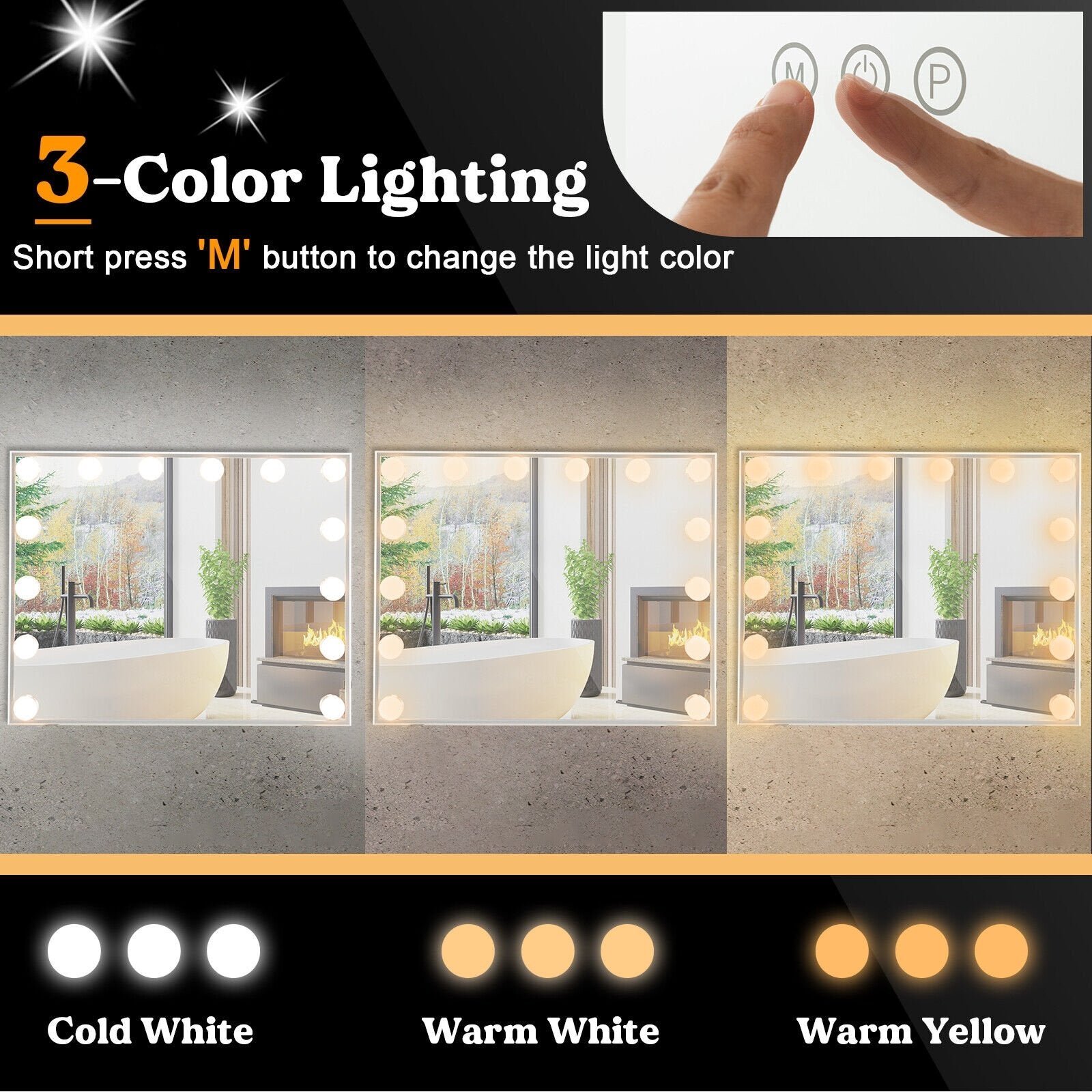 ● 3-Color Lighting and Adjustable Brightness: This tabletop vanity mirror is surrounded by 14 dimmable LED light bulbs whose brightness can be adjusted from 0% to 100% steplessly. Besides there are 3 lighting color modes for you to choose from: cold white (6000K) warm white (4200K) and warm yellow (3200K).