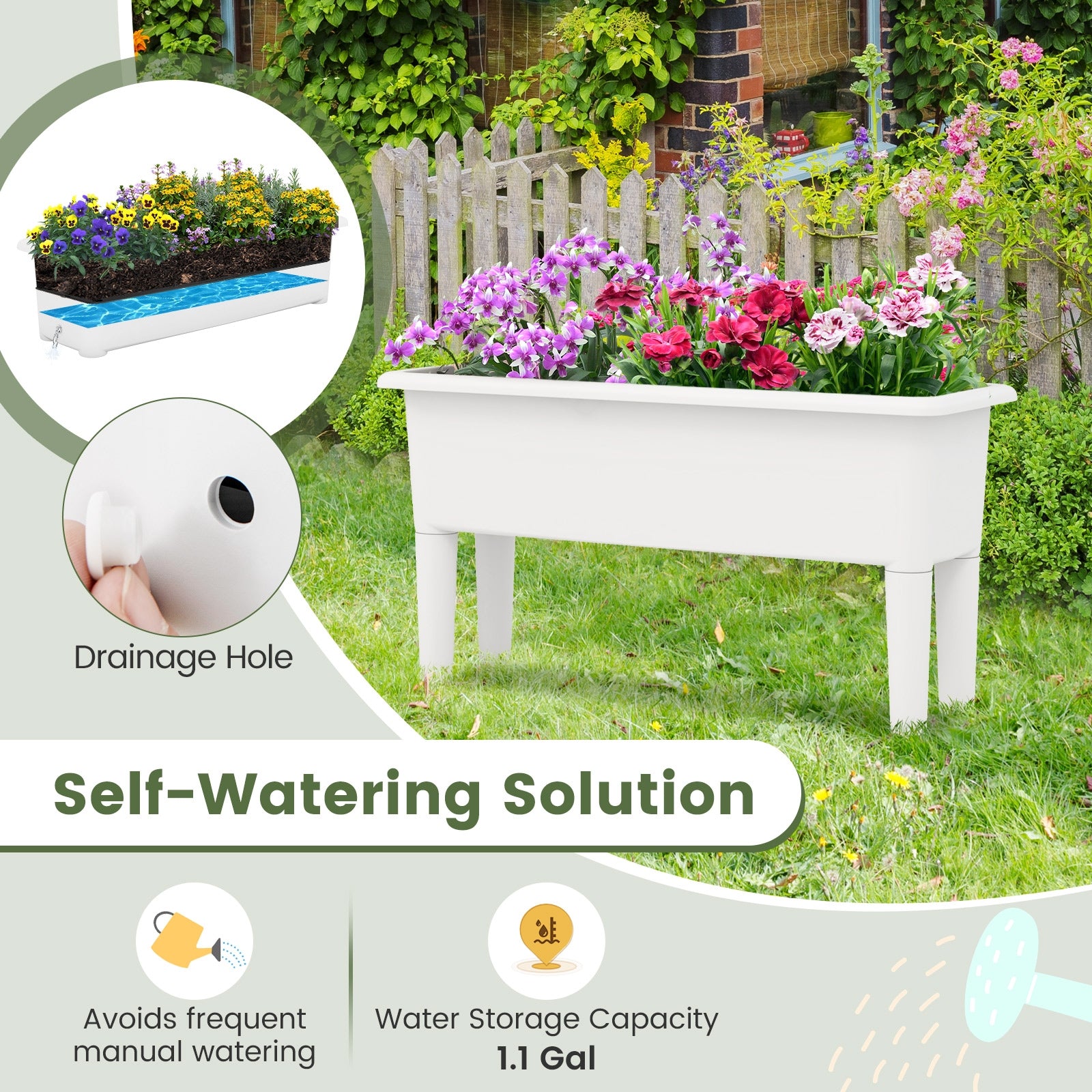 ● Self-Watering Feature: The elevated planter box ingeniously features a built-in self-watering system with a 1.1-gallon water reservoir to minimize maintenance for plants. Alongside its drainage hole ensures excess water escape for plant health.