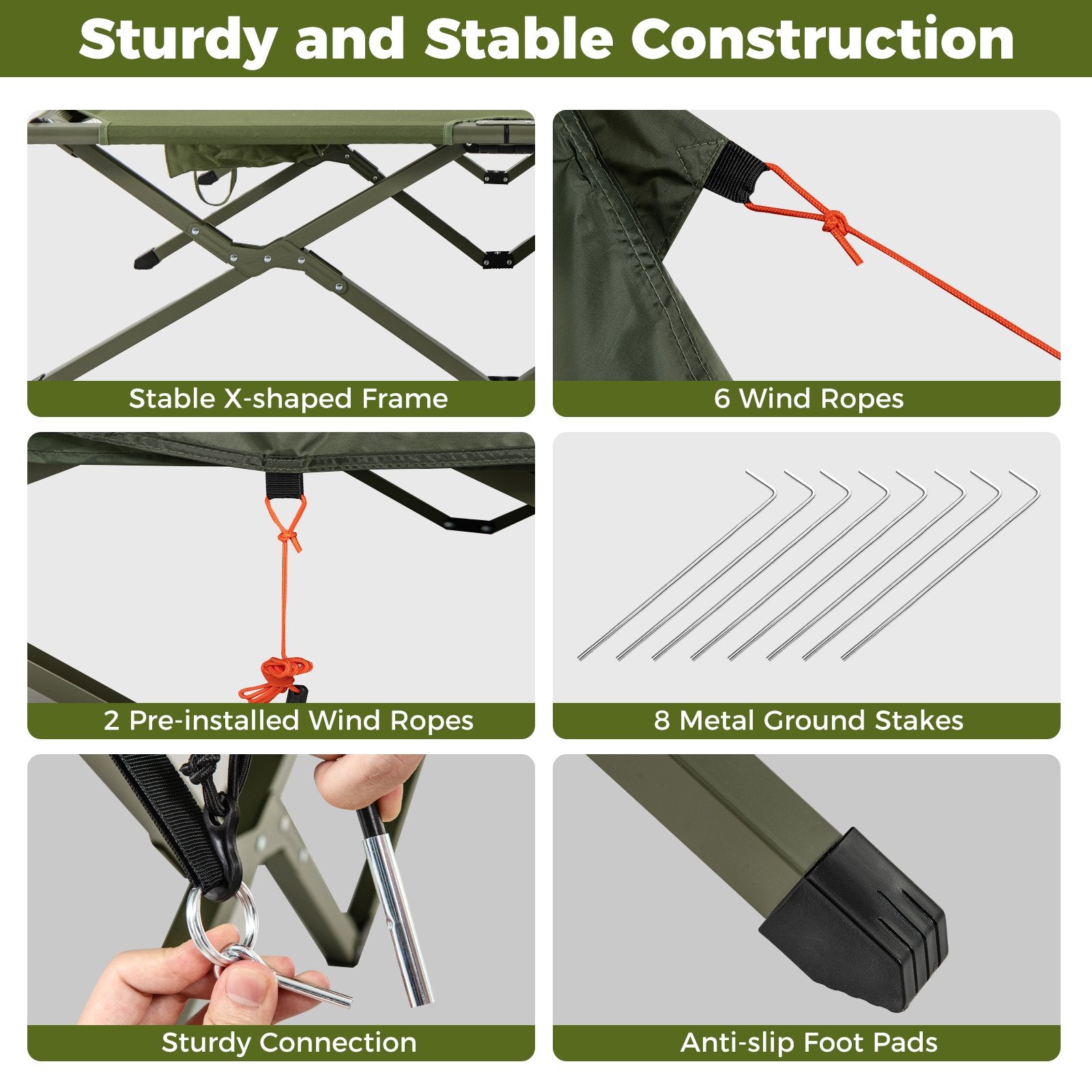● Easy Setup No Tools Required: The foldable tent boasts a user-friendly that sets up quickly with 2 fiberglass poles and 1 tent canopy while the cot unfolds easily without any tools. 2 parts are connected securely with buckles and elastic straps making assembly quick and hassle-free.