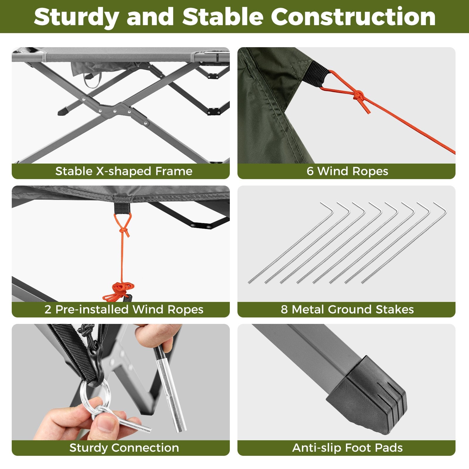 ● Easy Setup No Tools Required: The foldable tent boasts a user-friendly that sets up quickly with 2 fiberglass poles and 1 tent canopy while the cot unfolds easily without any tools. 2 parts are connected securely with buckles and elastic straps making assembly quick and hassle-free.