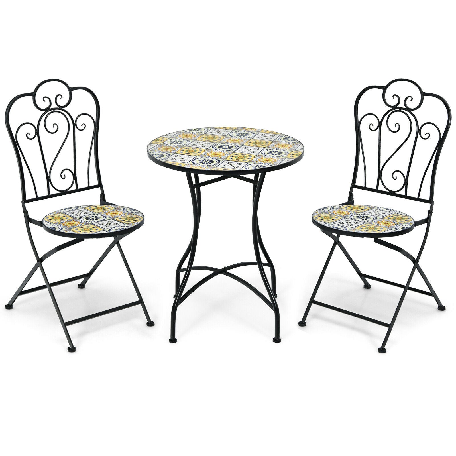 Designed with ergonomic backrests and ceramic tiles seats these patio chairs bring cool feelings while people sit on them. Meanwhile the sturdy steel frame with anti-slip foot pads can ensure strong stability. And the appropriate heights make them match your dining table (not included) perfectly. Therefore you can use them to have a delicious dinner outdoors. In order to add a unique touch to the places you want to put them these bistro chairs feature retro mosaic design and pretty floral patterns. After using these outdoor dining chairs just fold them for easy storage.