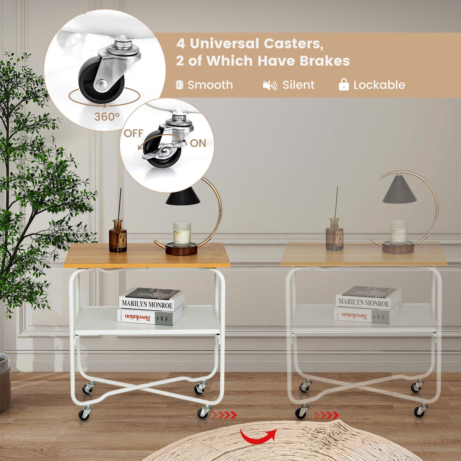 ● Additional Storage for Home: Equipped with a flat top and a metal lower shelf this rolling side table provides additional storage for your ornaments daily necessities magazines or other odds and ends. It will be a functional addition to small spaces.