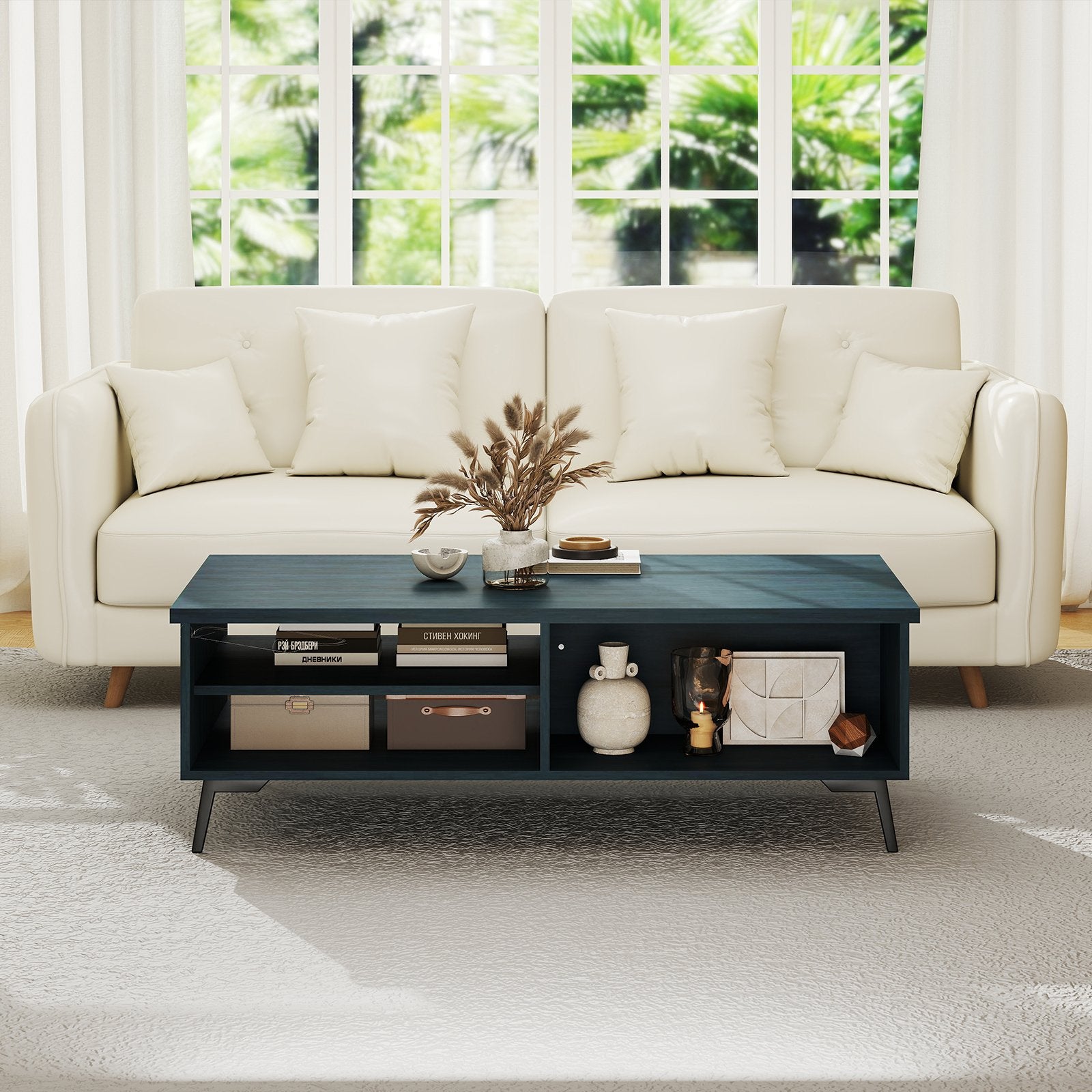 2-Tier Mid Century Modern Coffee Table with Storage Shelves Compartments-Blue