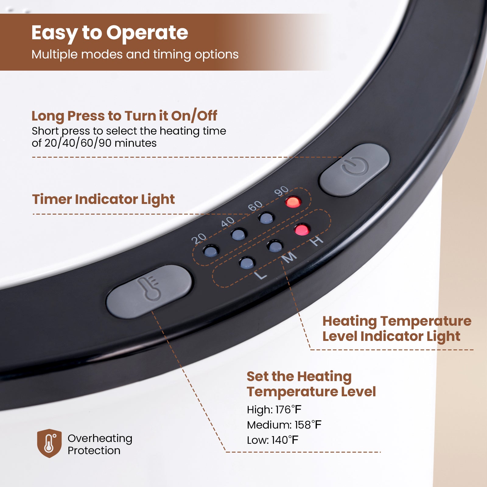 ● Easy Operation and Upgraded Safety: You can long press the power button to turn it on/off or short press to select the heating time of 20/40/60/90 minutes. The timer indicator light and heating temperature level indicator light will show you the current setting clearly. Plus the towel warmer features overheating protection for safe use.