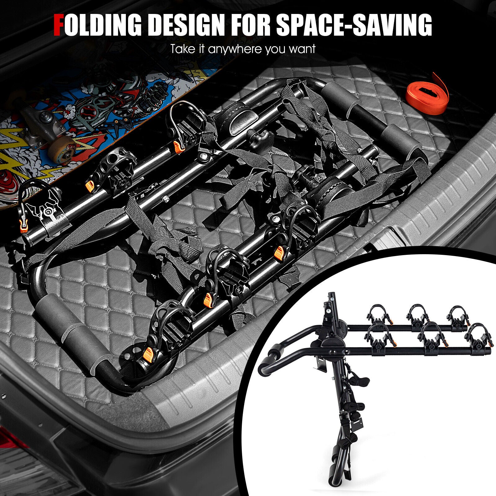 ● Foldable Bike Rack: If you do not need this 3-bike trunk mount rack you fold it into a compact size (28" L x 13" W x 8" H) which is easy for storage and transportation. In addition the simple design makes this trunk mounted bike rack a good match with vehicles.