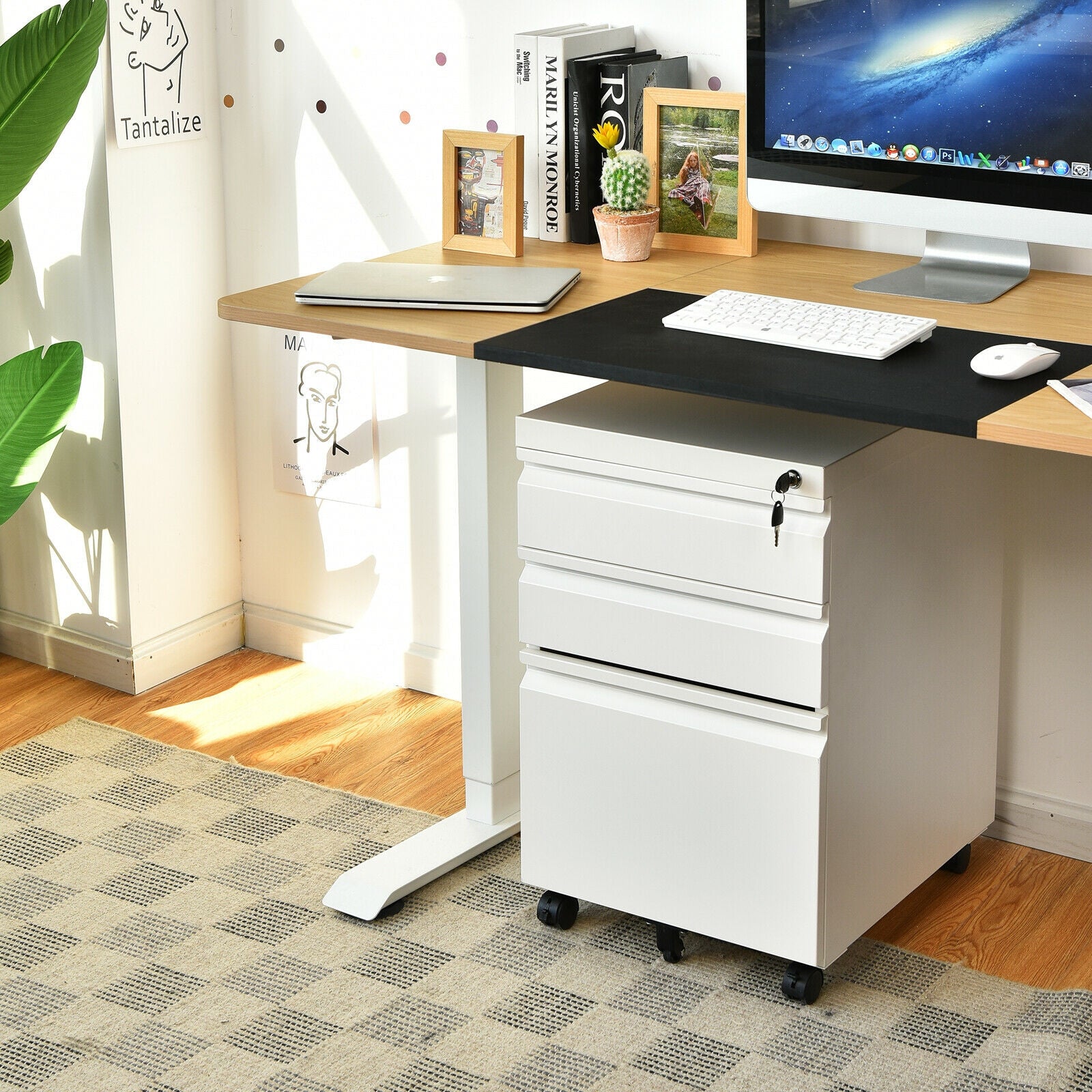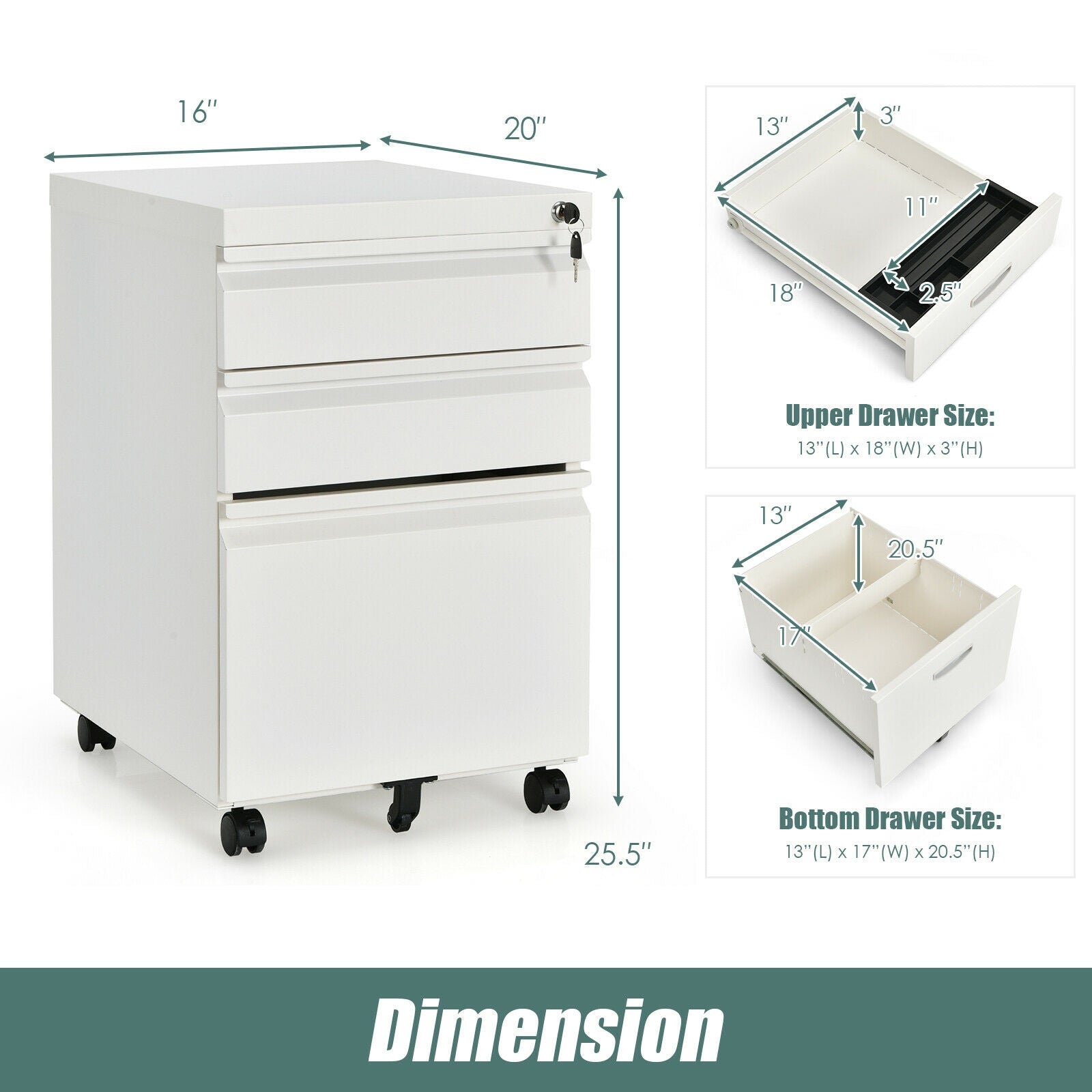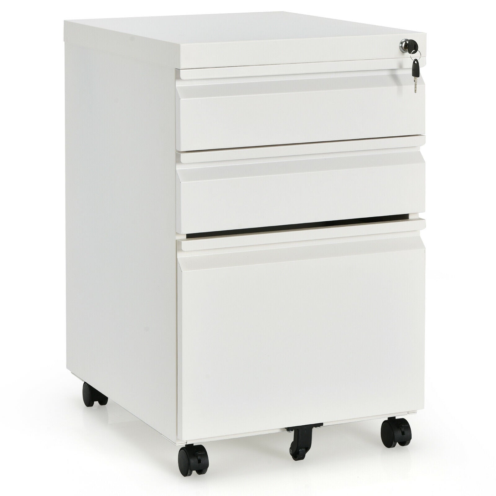 This file cabinet is designed with 3 drawers to facilitate convenient storage for multiple office supplies. A deep drawer with an adjustable hanging bar is adapted to store letter-size legal-size and A4 files. The removable pencil tray makes the desktop tidier. It also comes with two keys to ensure the privacy and safe of documents. Equipped with 5 smooth-rolling casters this file cabinet is easy to move anywhere you need. It is designed with a modern and concise look that perfectly decorates your home or office. This file cabinet will make you feel easier at work.