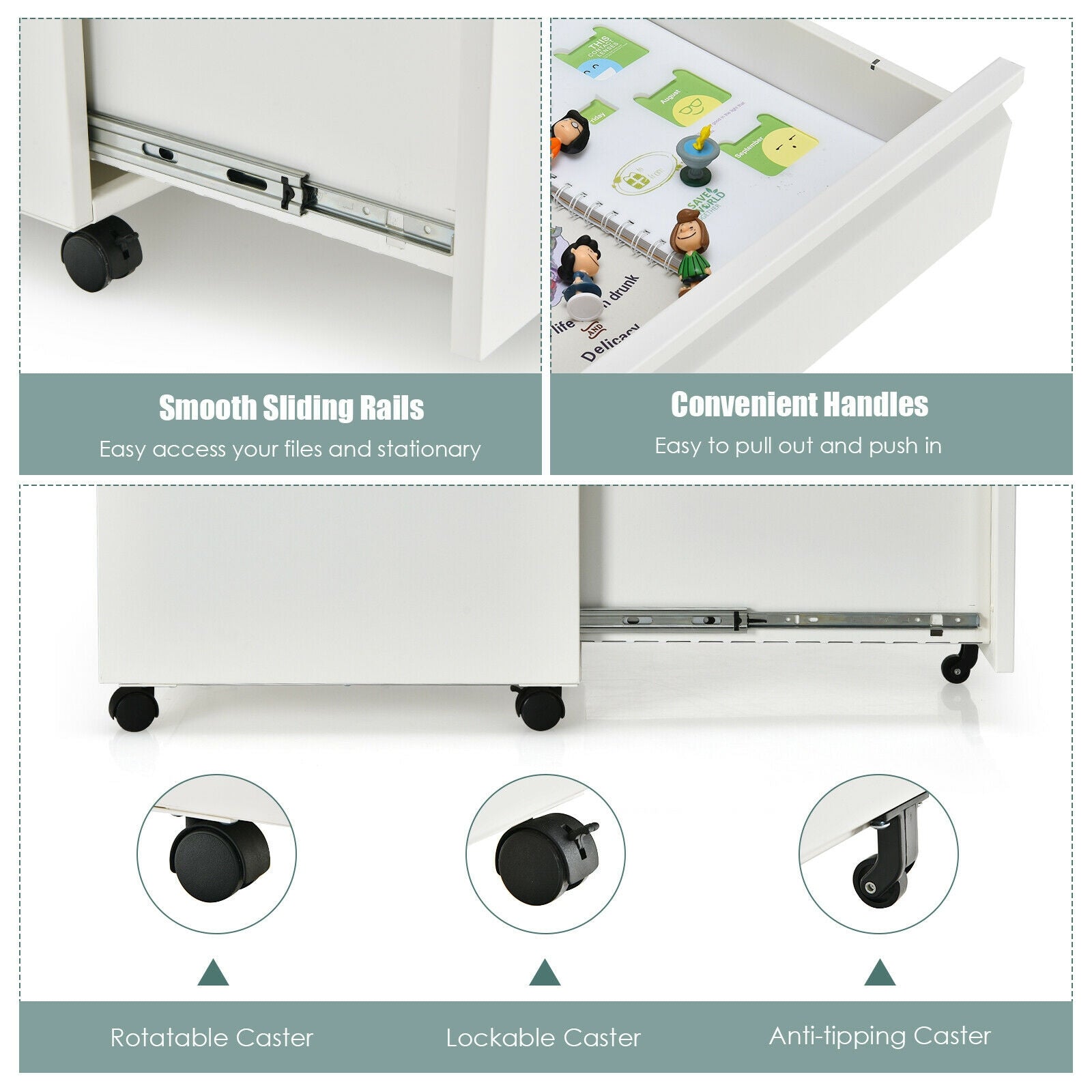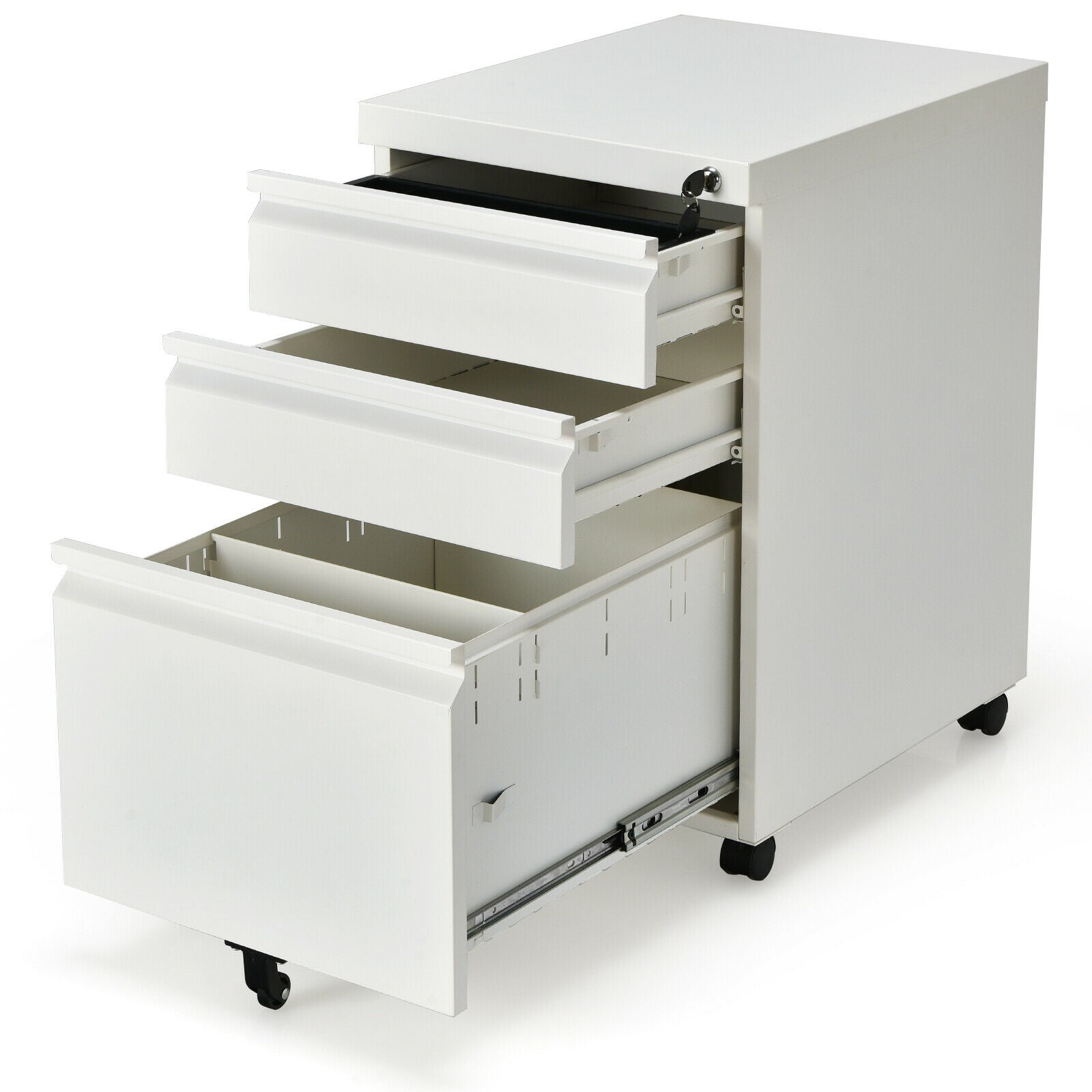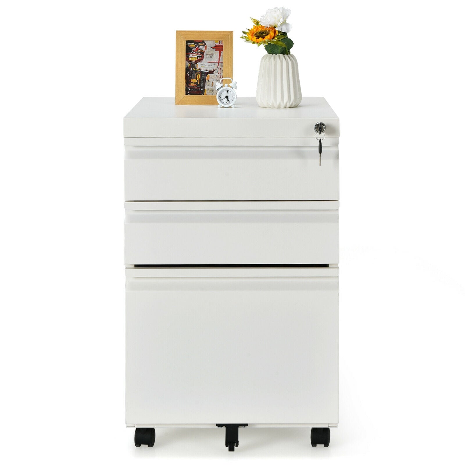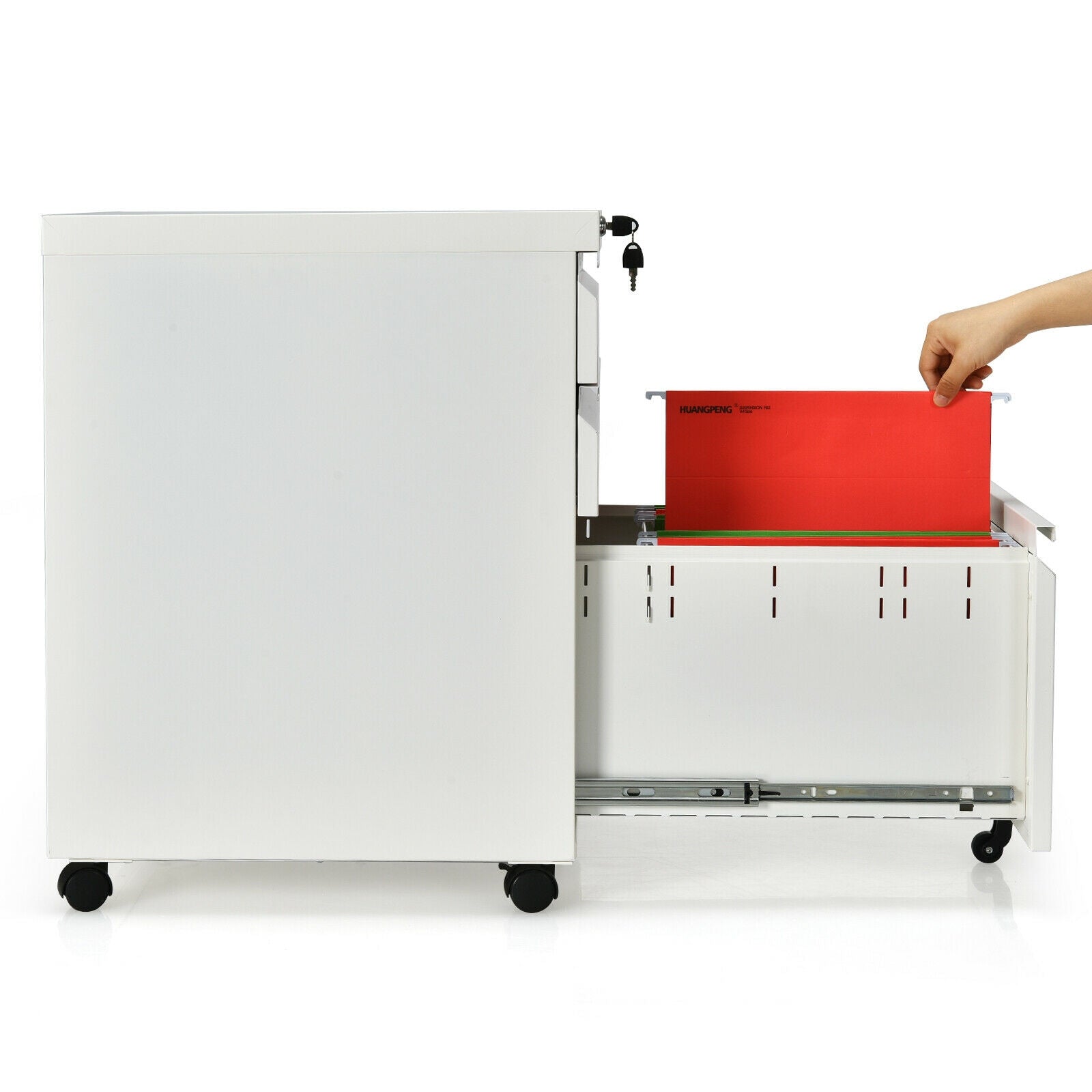 This file cabinet is designed with 3 drawers to facilitate convenient storage for multiple office supplies. A deep drawer with an adjustable hanging bar is adapted to store letter-size legal-size and A4 files. The removable pencil tray makes the desktop tidier. It also comes with two keys to ensure the privacy and safe of documents. Equipped with 5 smooth-rolling casters this file cabinet is easy to move anywhere you need. It is designed with a modern and concise look that perfectly decorates your home or office. This file cabinet will make you feel easier at work.