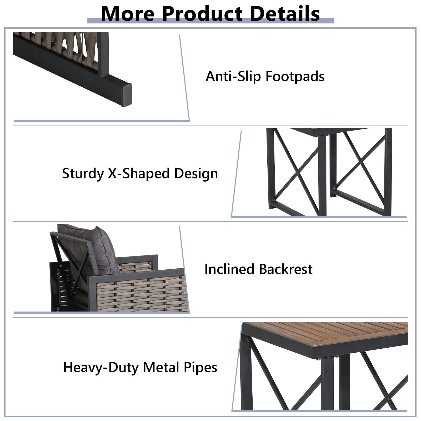● Strengthened Metal Structure: Both the chairs and table feature heavy-duty metal frame for high stability which is also powder-coated for rust resistance. The X-shaped design on the two sides of the table and the backrest of the seat highly strengthens the overall structure. Moreover the anti-slip footpads protect the ground well and make the 3 pieces stand more stable.