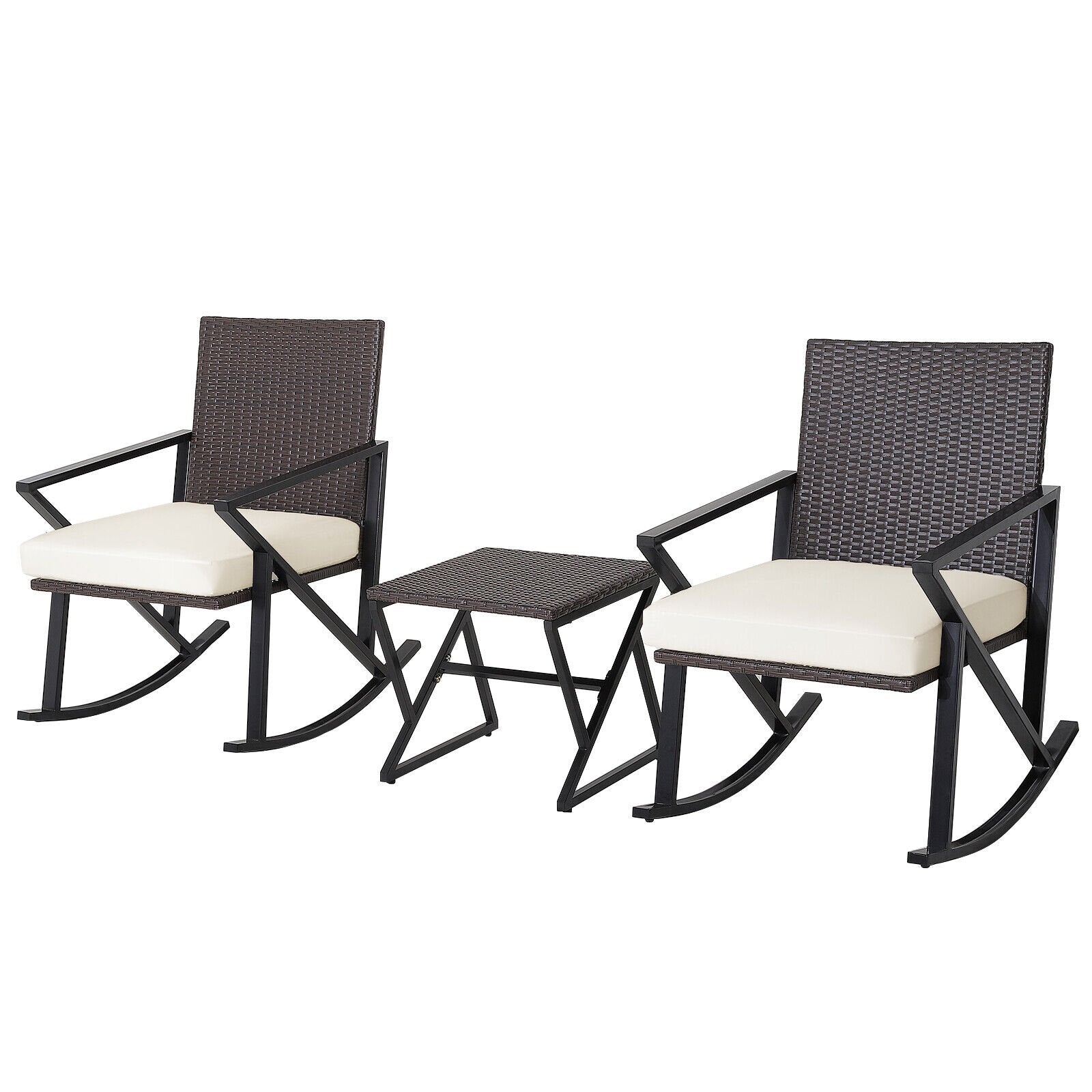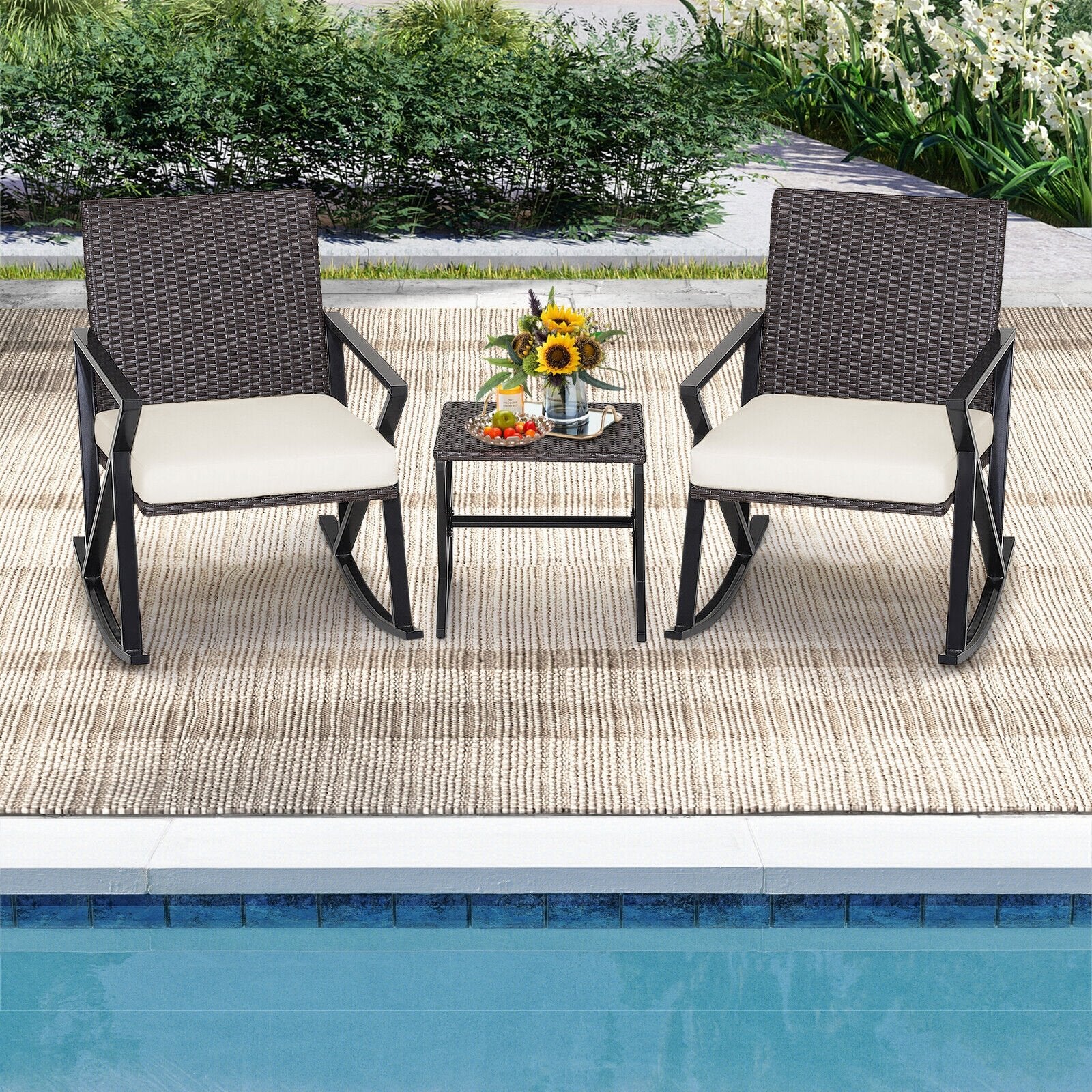 ● Assemble Without Effort: The assembly of the 3 pieces won't cost too much time or effort as the patio rocking set comes with a detailed instruction and complete accessories. Please do not tighten all the screws until all the holes are aligned. Dimension of each chair: 34" x 24" x 33" (L x W x H). Dimension of coffee table: 18" x 18" x 17" (L x W x H).
