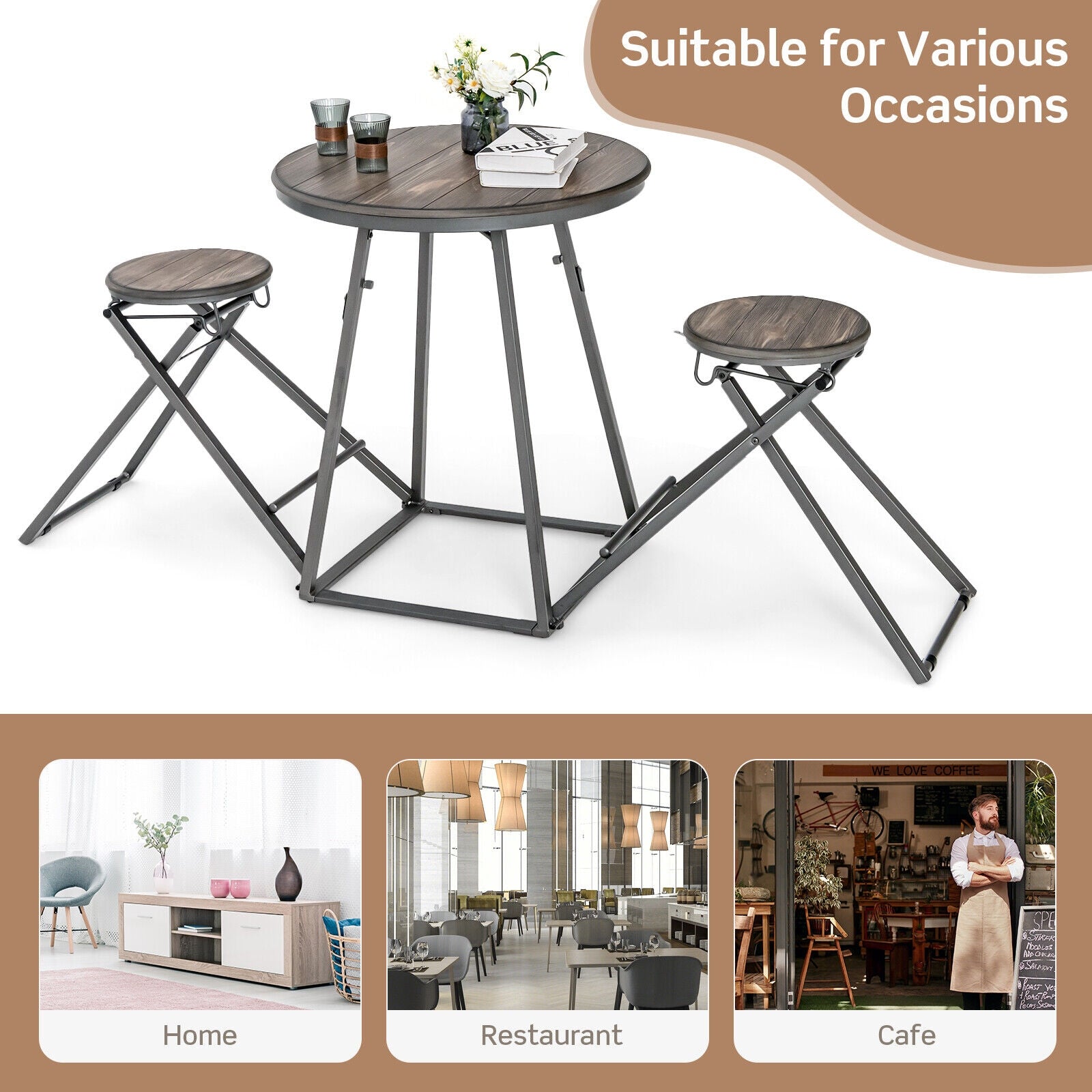Modern table and stools set brings a charming and unique style to your space. These stools are connected to the round table  and can be easily folded and stored under the table. This unique design not only makes it more decorative  but also saves your space. Made from high-quality MDF panels and sturdy steel  this dining table and chair set is super sturdy and durable  and the square table base and X-shaped structure of stools also provide stability. Besides  the anti-slip foot pads of stools and adjustable feet of the table protect the floor from scratches. This 3-piece round table set has wide applications and is perfect for the apartment  cafe  restaurant  etc.