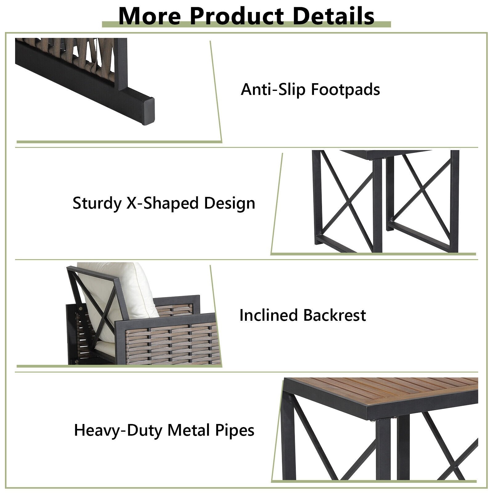 ● Strengthened Metal Structure: Both the chairs and table feature heavy-duty metal frame for high stability which is also powder-coated for rust resistance. The X-shaped design on the two sides of the table and the backrest of the seat highly strengthens the overall structure. Moreover the anti-slip footpads protect the ground well and make the 3 pieces stand more stable.