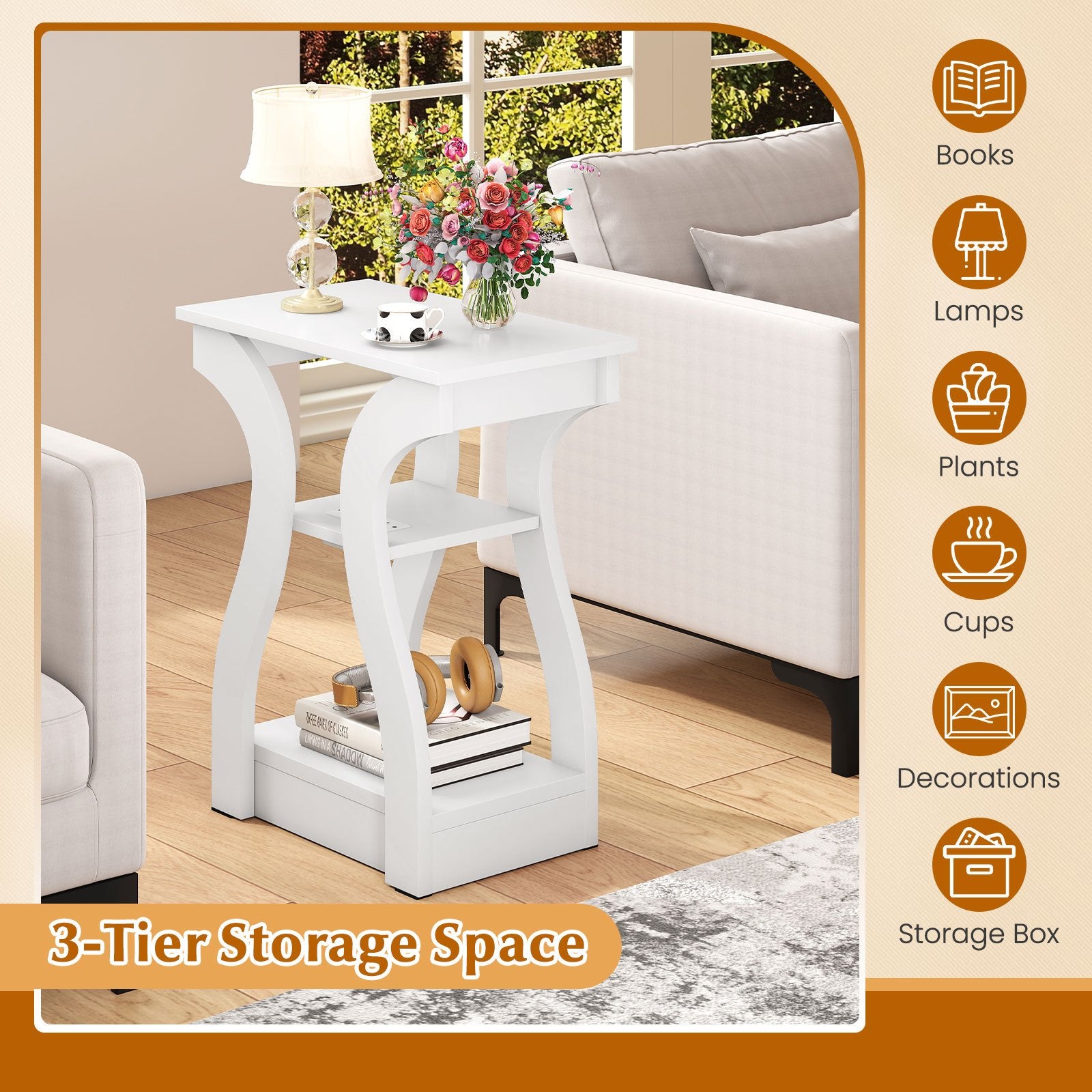 3-Tier Storage Space: Featuring 3-tier design the sofa side tables simplify the organization of daily items. The wide tabletop provides ample space for cups lamps and ornaments while the open shelves offer easy access to books and storage boxes.