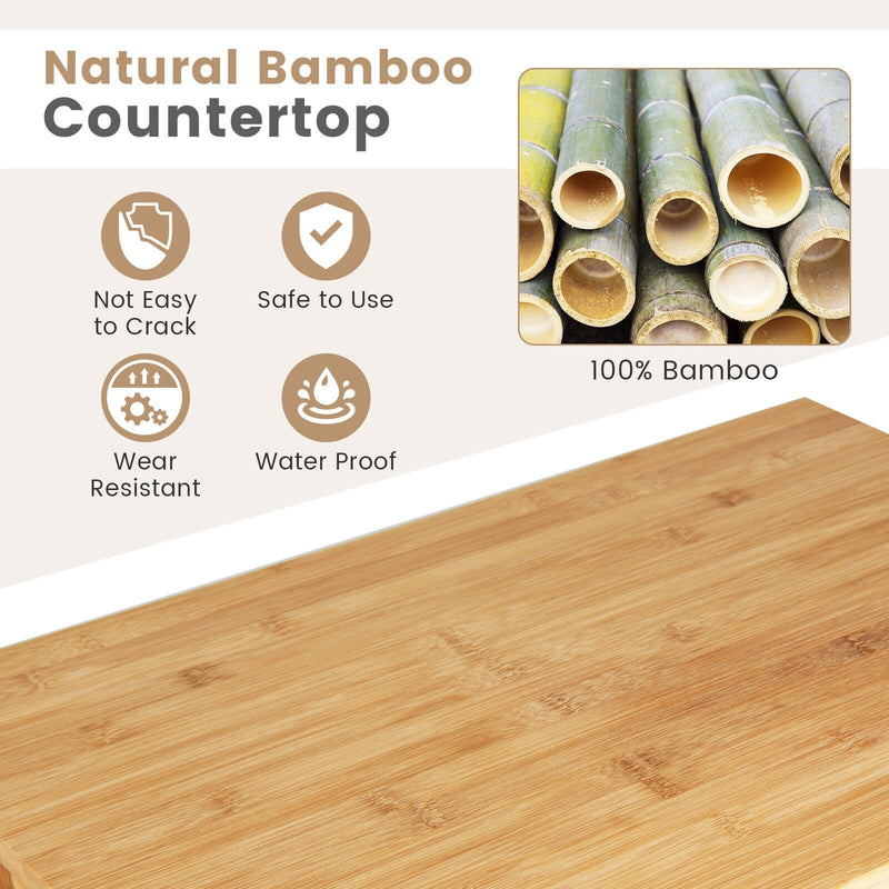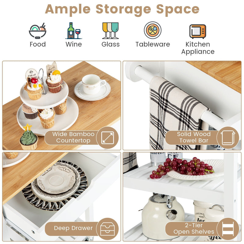 3-Tier Kitchen Island Cart Rolling Service Trolley with Bamboo Top-White