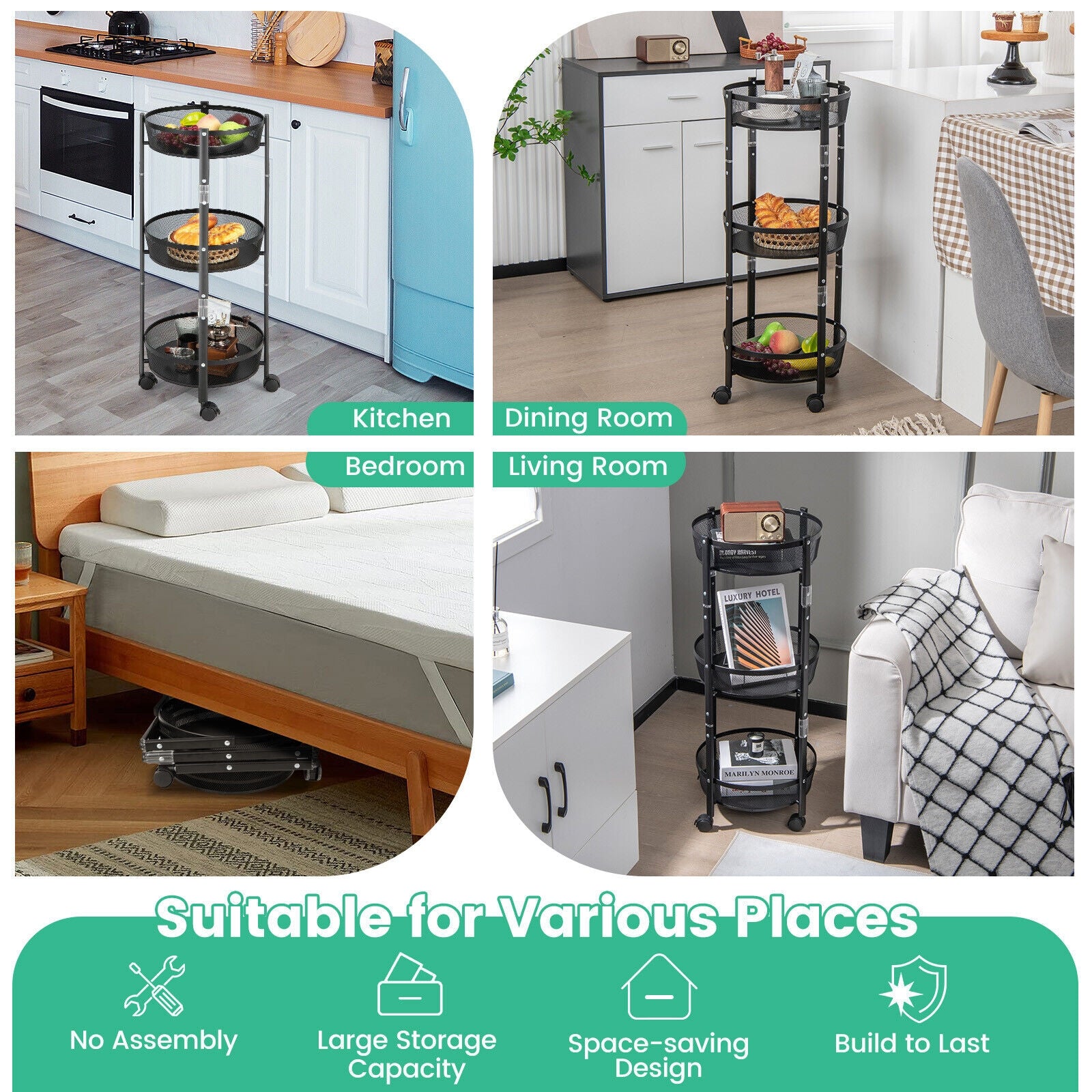 ● No Assembly Required: Adopting advanced one-second folding and opening technology this 3-tier utility rolling cart frees you from complicated installation. Just pull it up in 1 second and fix the locking system. When not in use you can fold down the cart instantly into a compact size and store it in your cupboard.