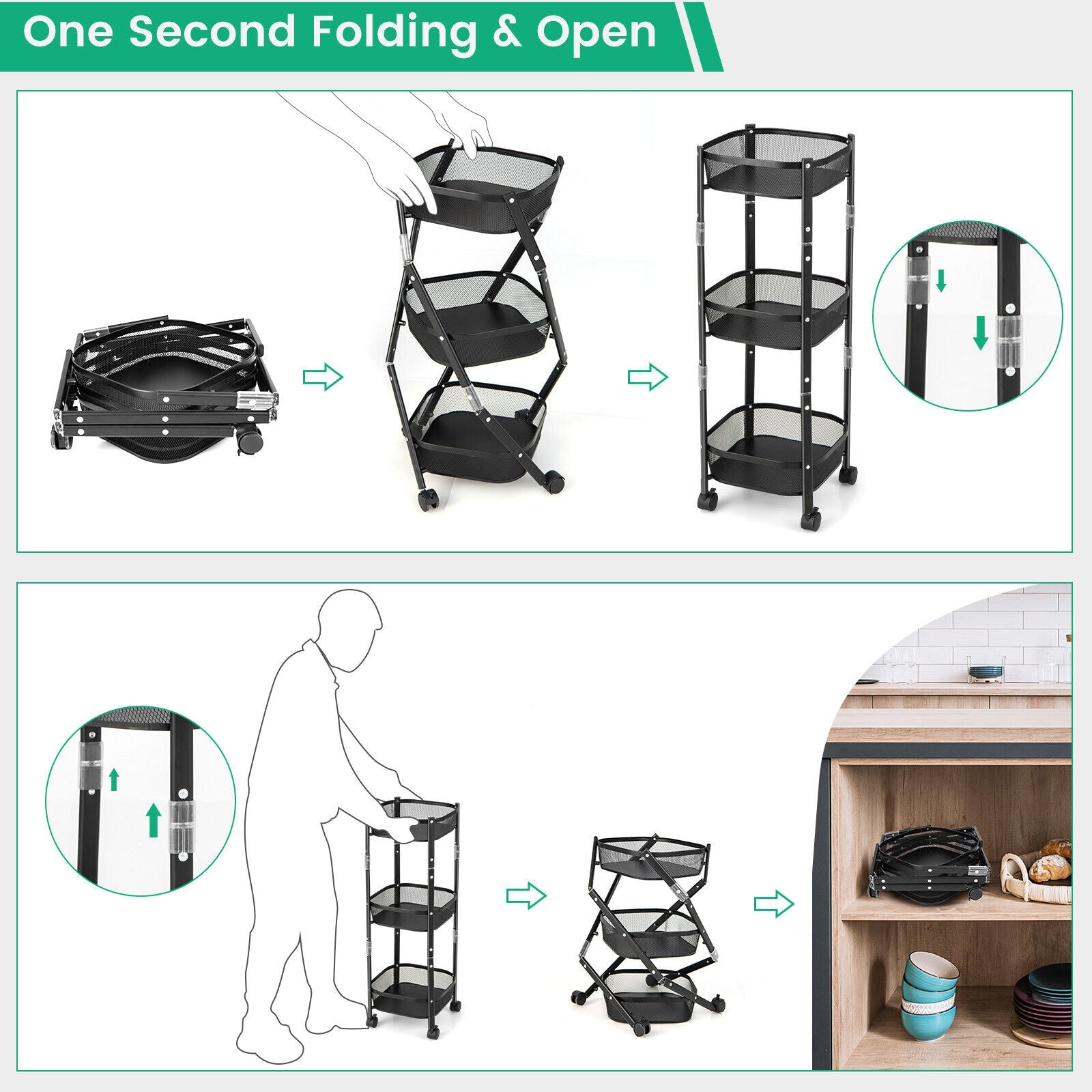 ● No Assembly Required: Adopting advanced one-second folding and opening technology this 3-tier utility rolling cart frees you from complicated installation. Just pull it up in 1 second and fix the locking system. When not in use you can fold down the cart instantly into a compact size and store it in your cupboard.