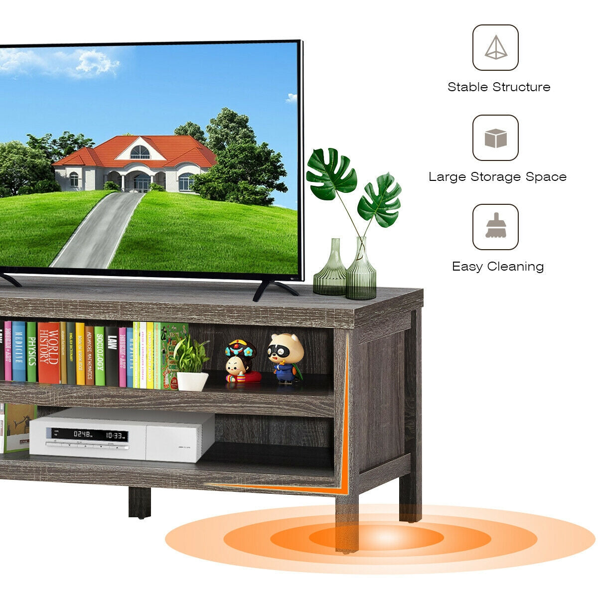 • Open storage design for Blu-ray players game consoles and media accessories