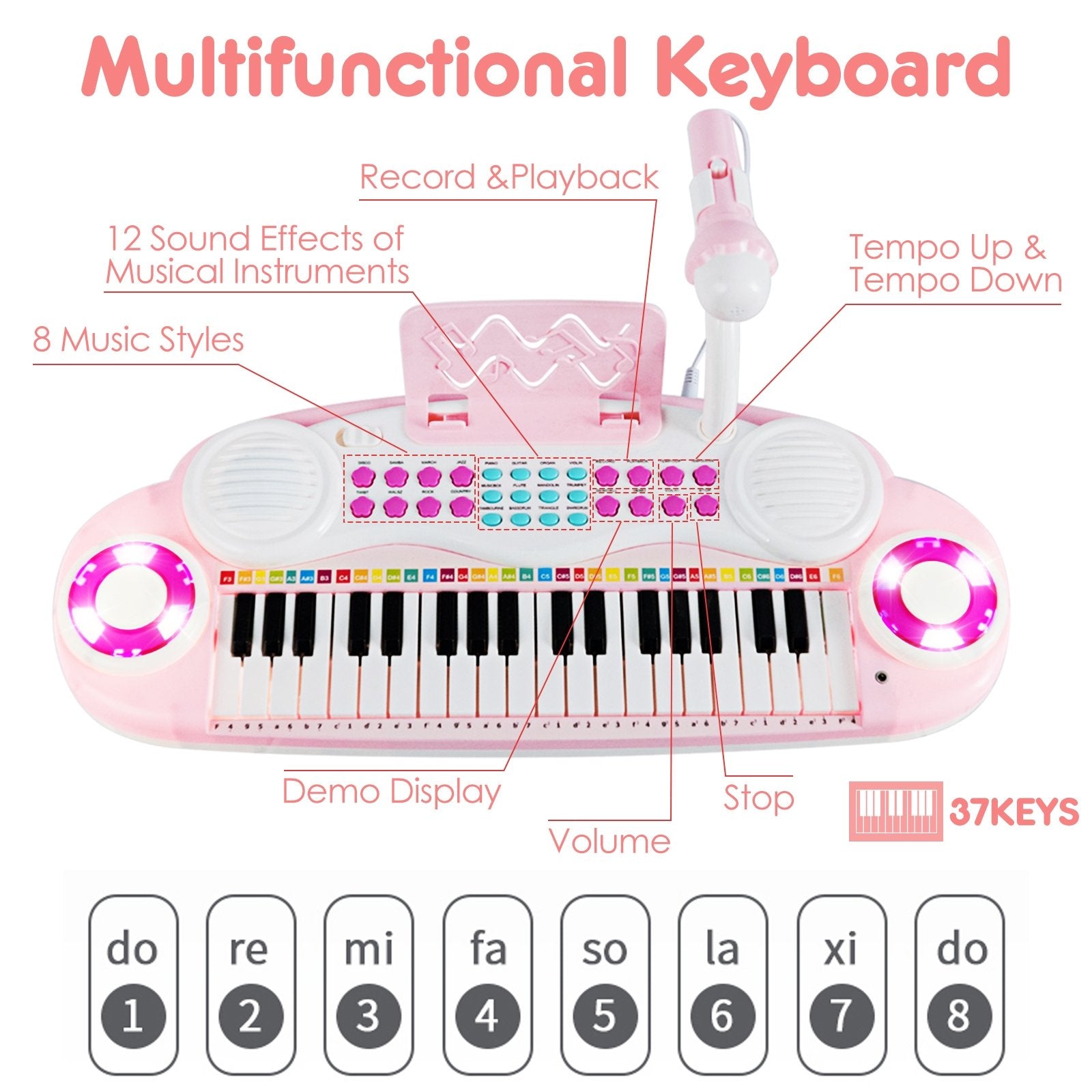 ● 37 Keys and Multiply Functions: The 37-key keyboard has 8 rhythms that switch between jazz march samba disco country twist waltz and rock for more fun ways to play along. Besides it features 8 kinds of instrument sounds 4 kinds of percussion sounds and adjusted volume and speed to play freely.