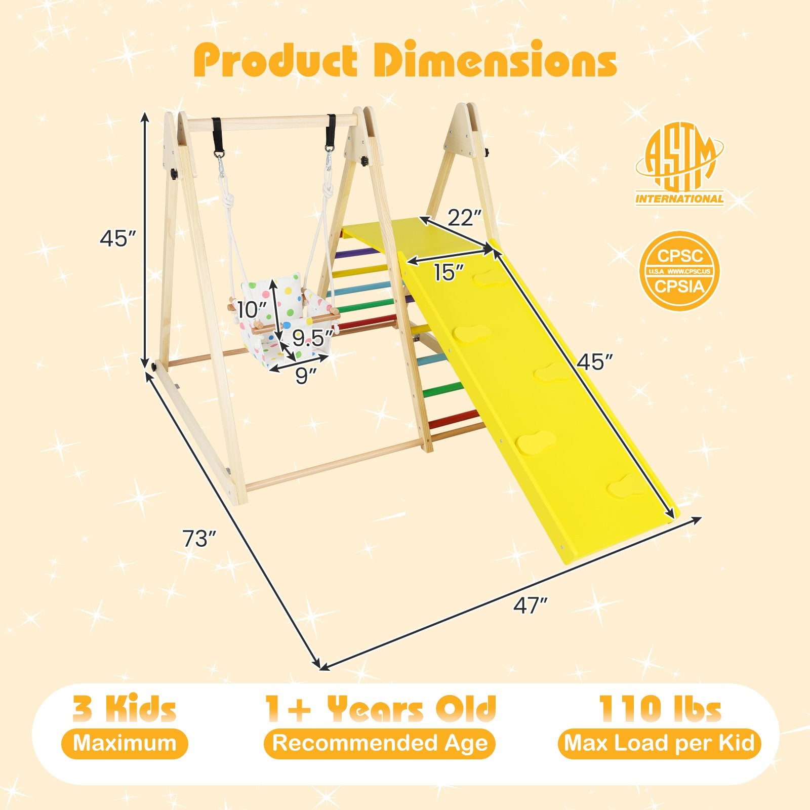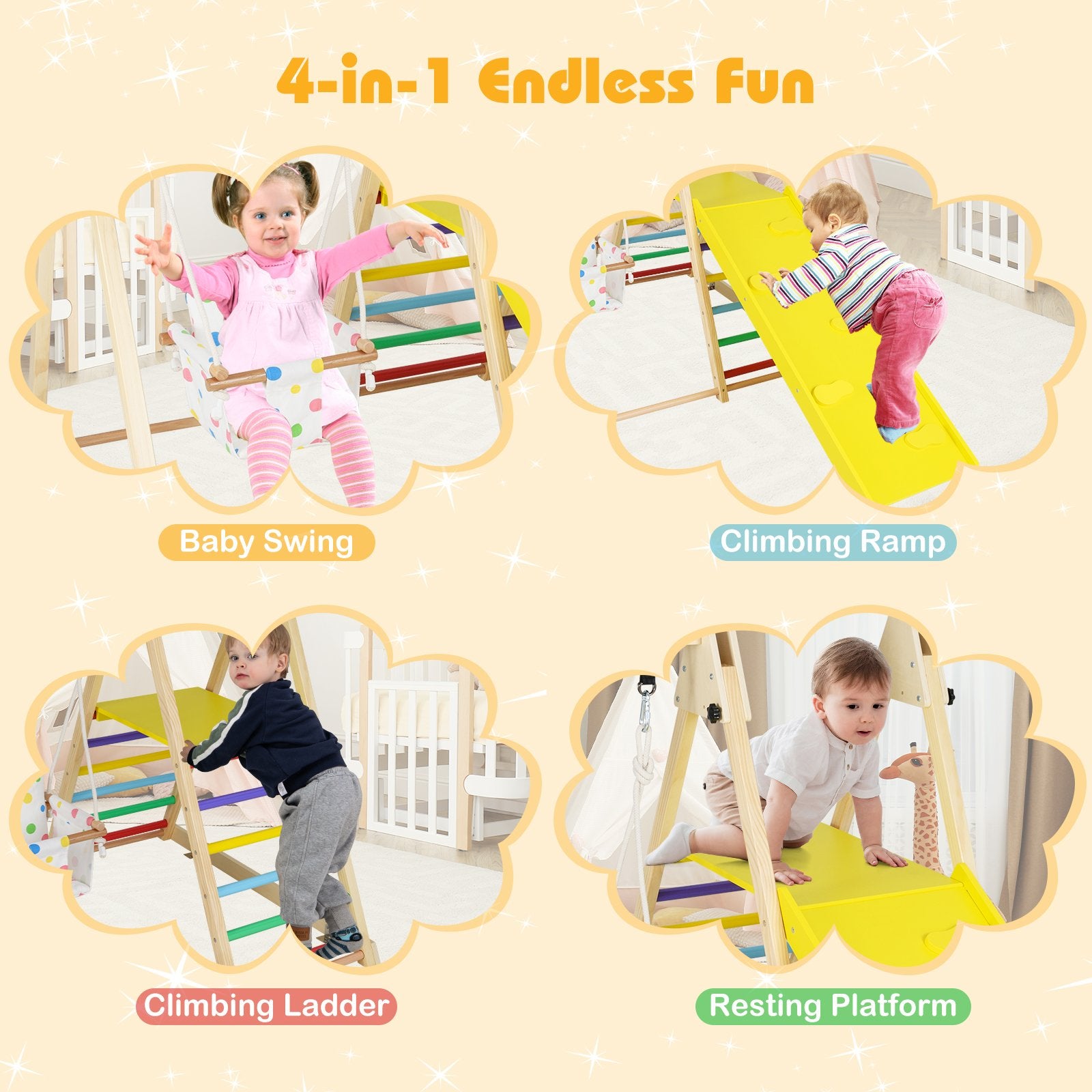 ● 4-in-1 Multipurpose Design: This indoor jungle gym consists of a baby swing resting platform climbing ladder and ramp offering little ones endless hours of fun and physical play. The climbing ramp boasts adjustable height levels perfect for children's various needs.