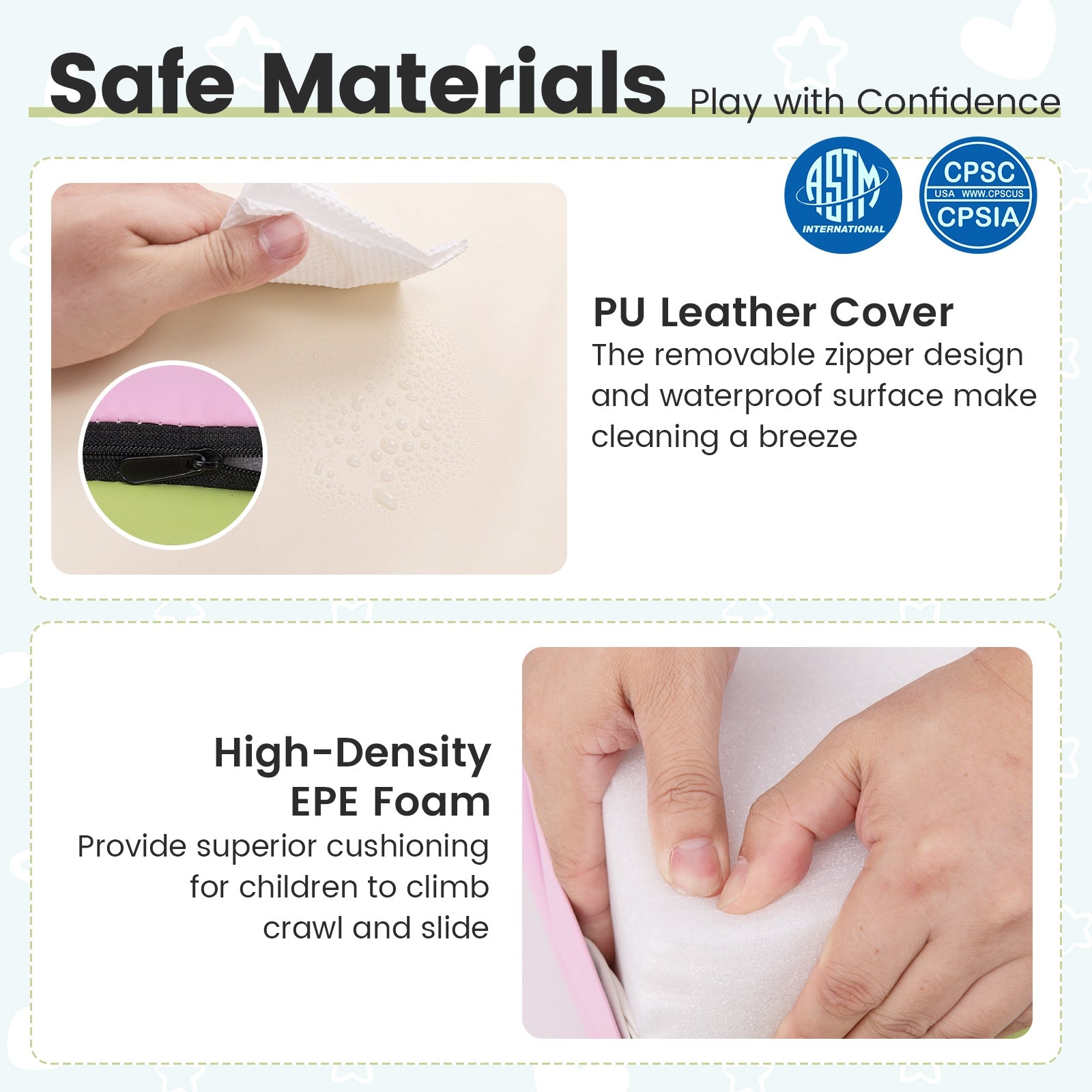 ● Hassle-Free Cleaning: Maintenance is a breeze with PU leather covers which are soft to the touch and easy to clean thanks to their waterproof surface. You can simply unzip to clean covers for a fresh play environment time after time.