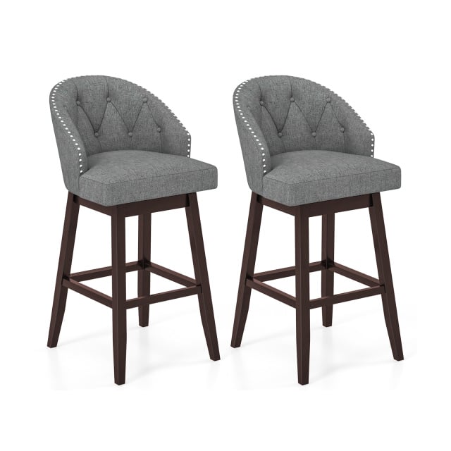 A pair of swivel bar stools with tufted backs and rubber wood legs perfect for kitchen islands and bar tables.