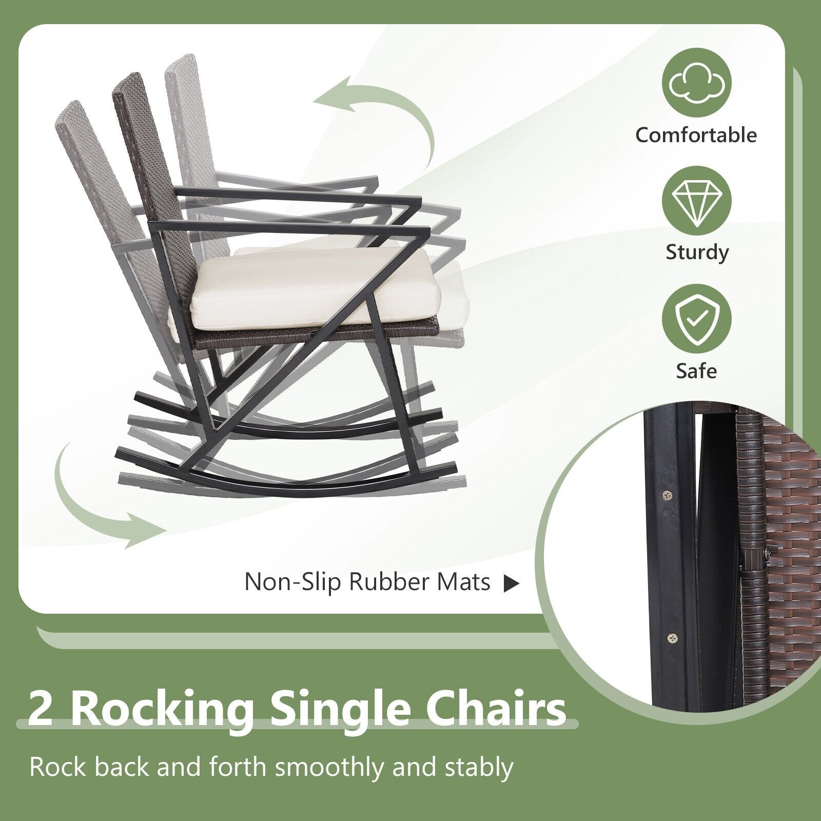 ● Enjoy Softness of Cushions: Each rocking chair and the loveseat are equipped with 3.2" thickened seat cushions which are filled with high-density sponge making the seat much softer to sit. Moreover the cushion cover is designed with a smooth zipper for easy removal and maintenance.