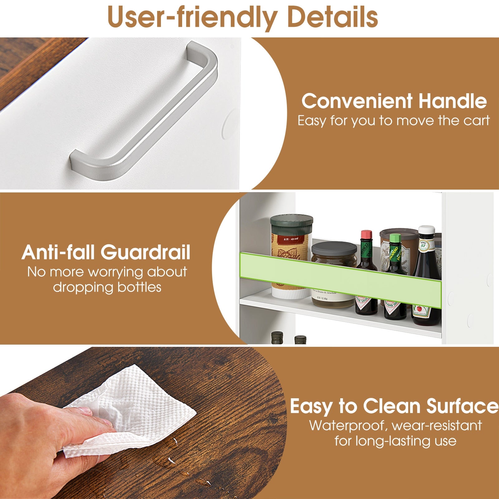 ● Varied Shelf Heights for Smart Organization: Treat your belongings to dedicated spaces on shelves of different heights complete with guardrails that prevent spills or toppling items. This versatile cart easily holds cans condiments and drinks of varied heights.
