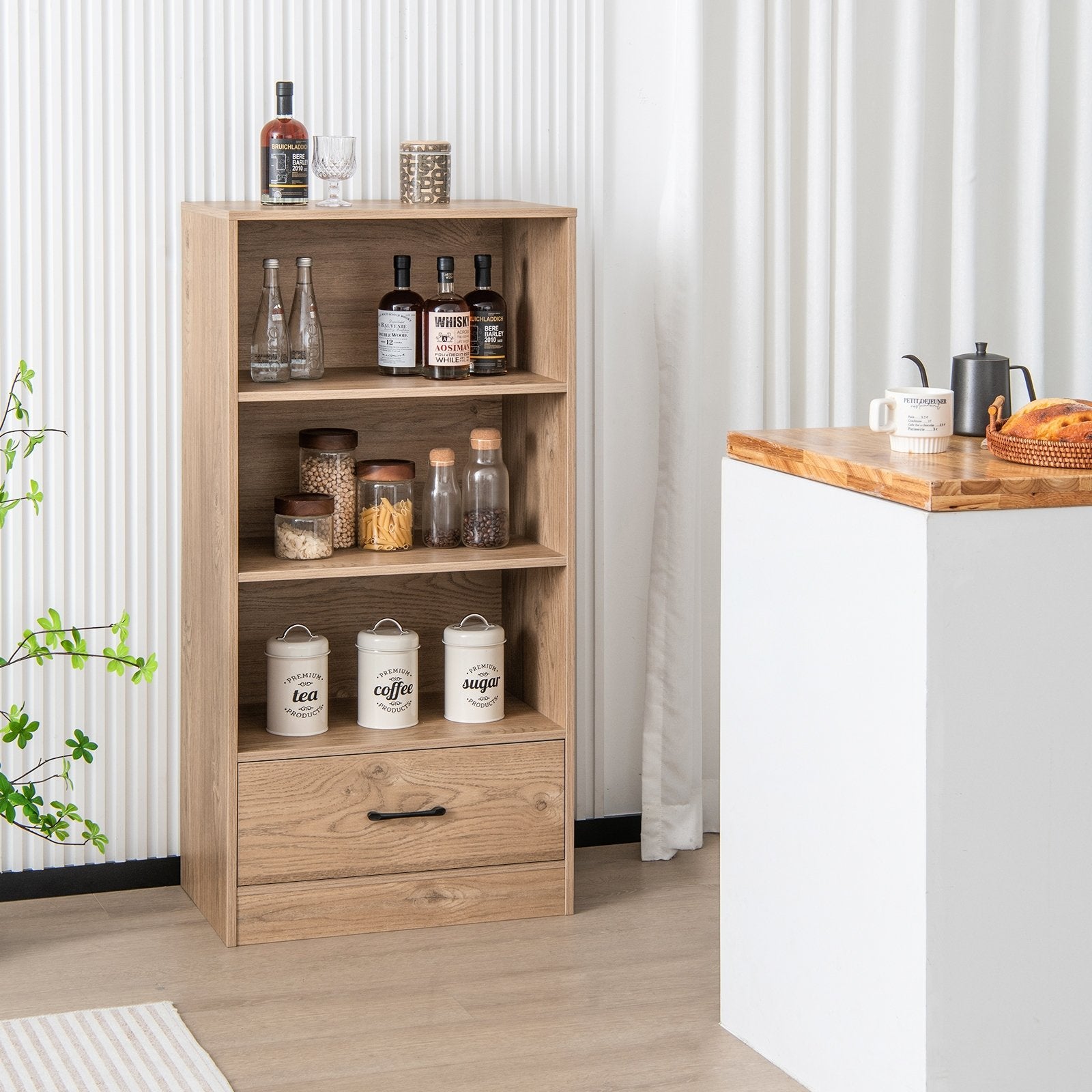● Ample Storage Capacity: The 4-tier bookcase is equipped with a spacious top 3 open shelves and 1 large drawer to satisfy your needs. Thus you can stash books vinyls or show off your favorite ceramics and ornaments to level up your living space.