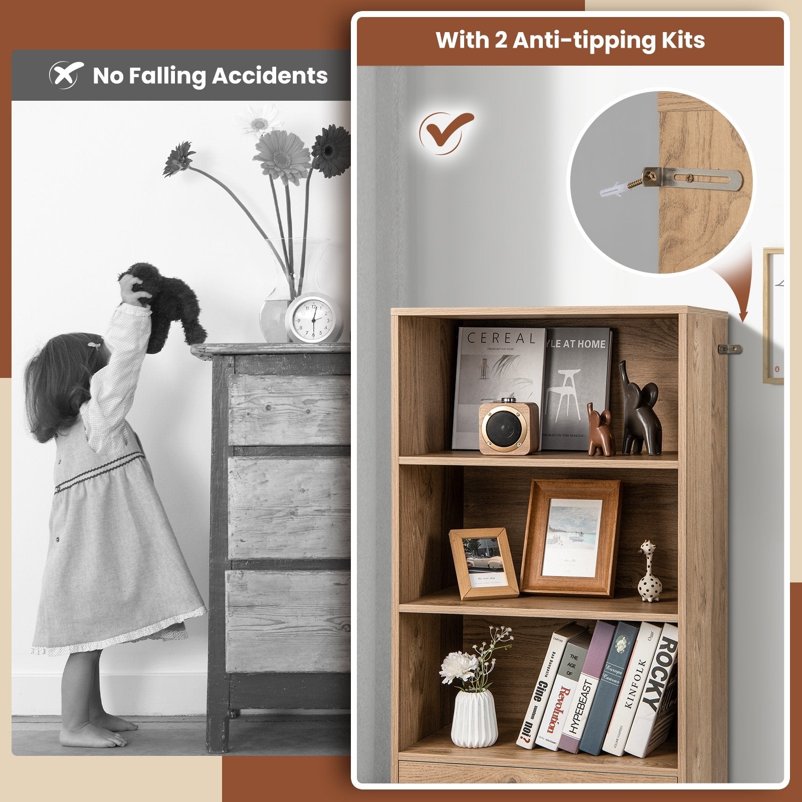 -Sturdy anti-tipping kits keep the cabinet firm in place