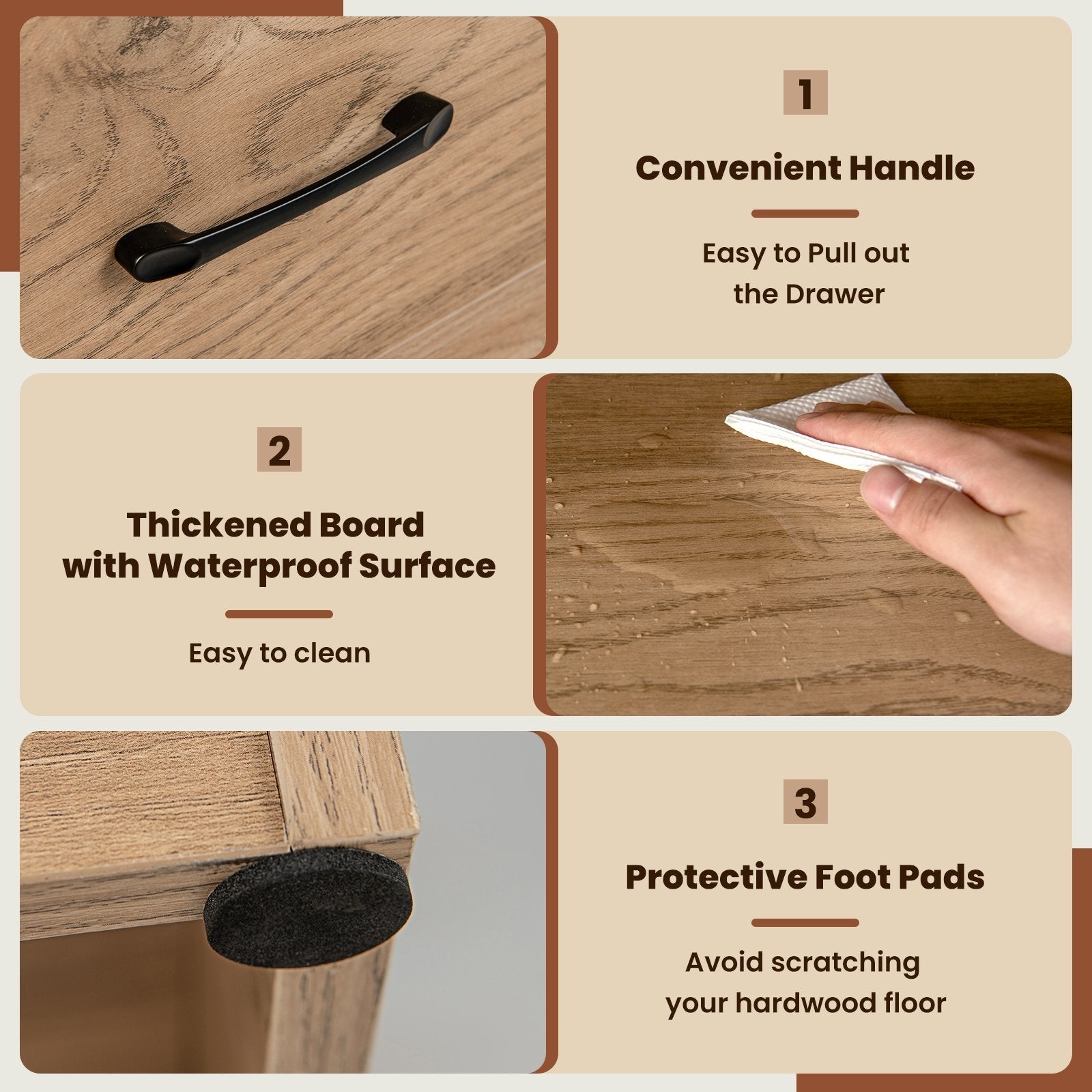 ● Detail Matters: The storage drawer is fitted with premium metal slides and convenient handle for a smooth and quiet pull. At the base there are protective foot pads that avoid scratching your hardwood floor while keeping excellent stability.