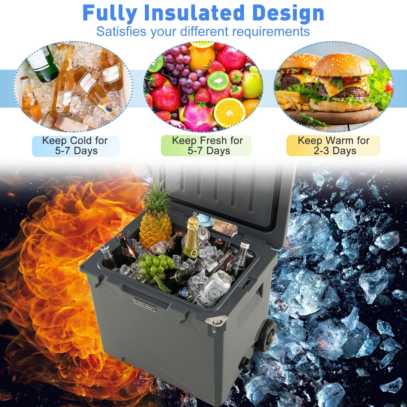 ● Fully Insulated Design: This wheeled cooler features a rotomolded design with a freezer-style gasket that ensures better sealing and prevents leakage. Hence it boasts full ice storage of 5-7 days. Besides the insulated hard cooler satisfies your different requirements since it can also keep fresh for 5-7 days and keep warm for 2-3 days.