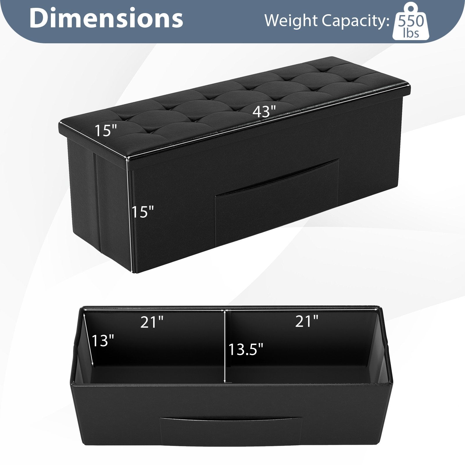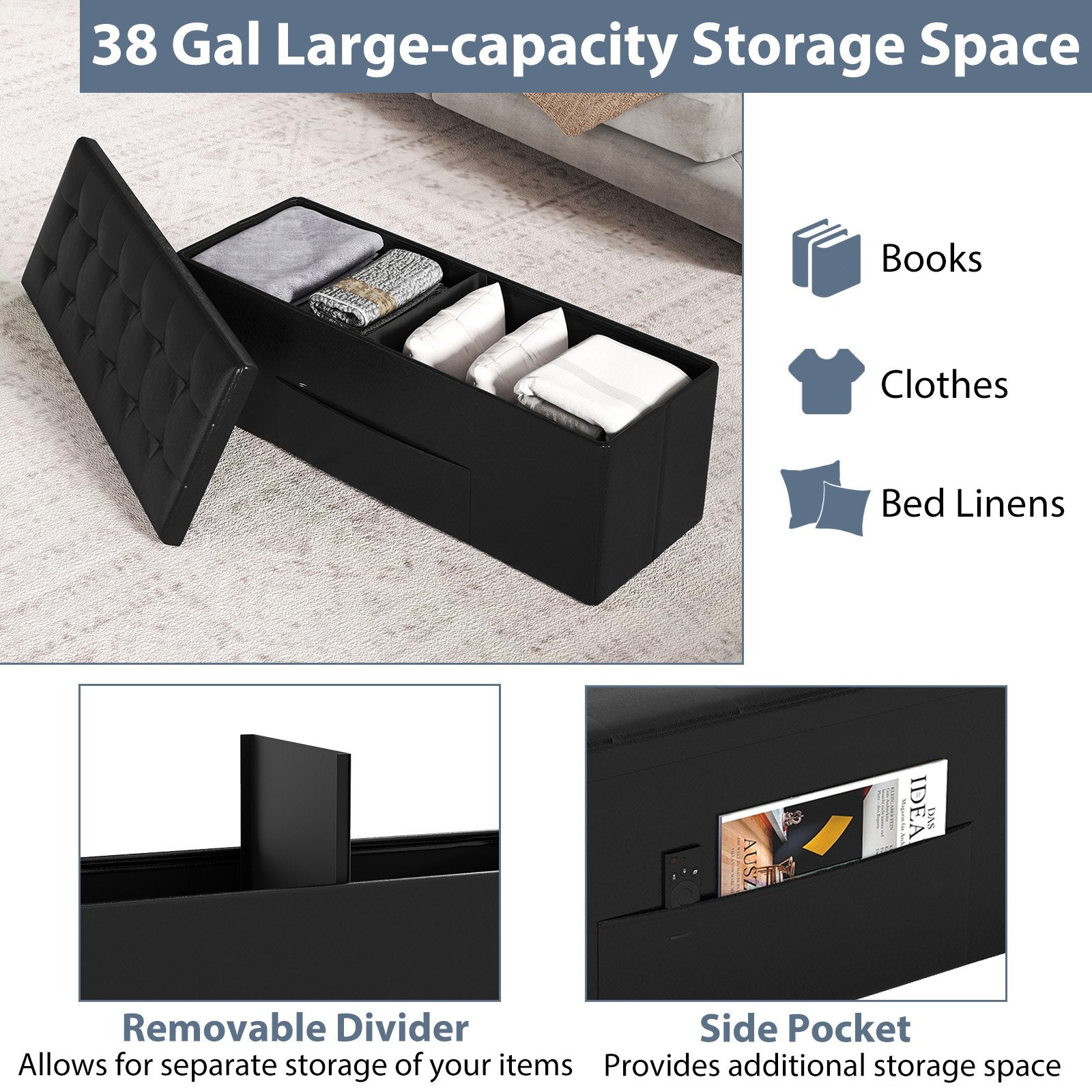● 38 Gallon Storage Capacity: This 43-inch storage ottoman with removable divider features a 38 gal capacity allowing you to arrange inner space to store blankets cushions and out-of-season clothes. Plus the side pocket keeps items at hand.