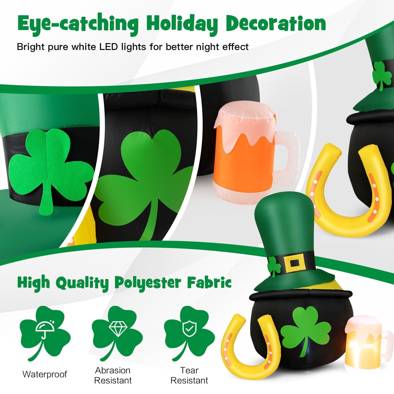 ● Awesome St Patrick's Day Decoration: This holiday decoration stands out its combination of leprechaun hat gold pot lucky shamrock and beer mug which increases strong festive atmosphere. Standing at 5ft tall when fully inflated the inflatable decoration will create a memorable scene during the holiday season.