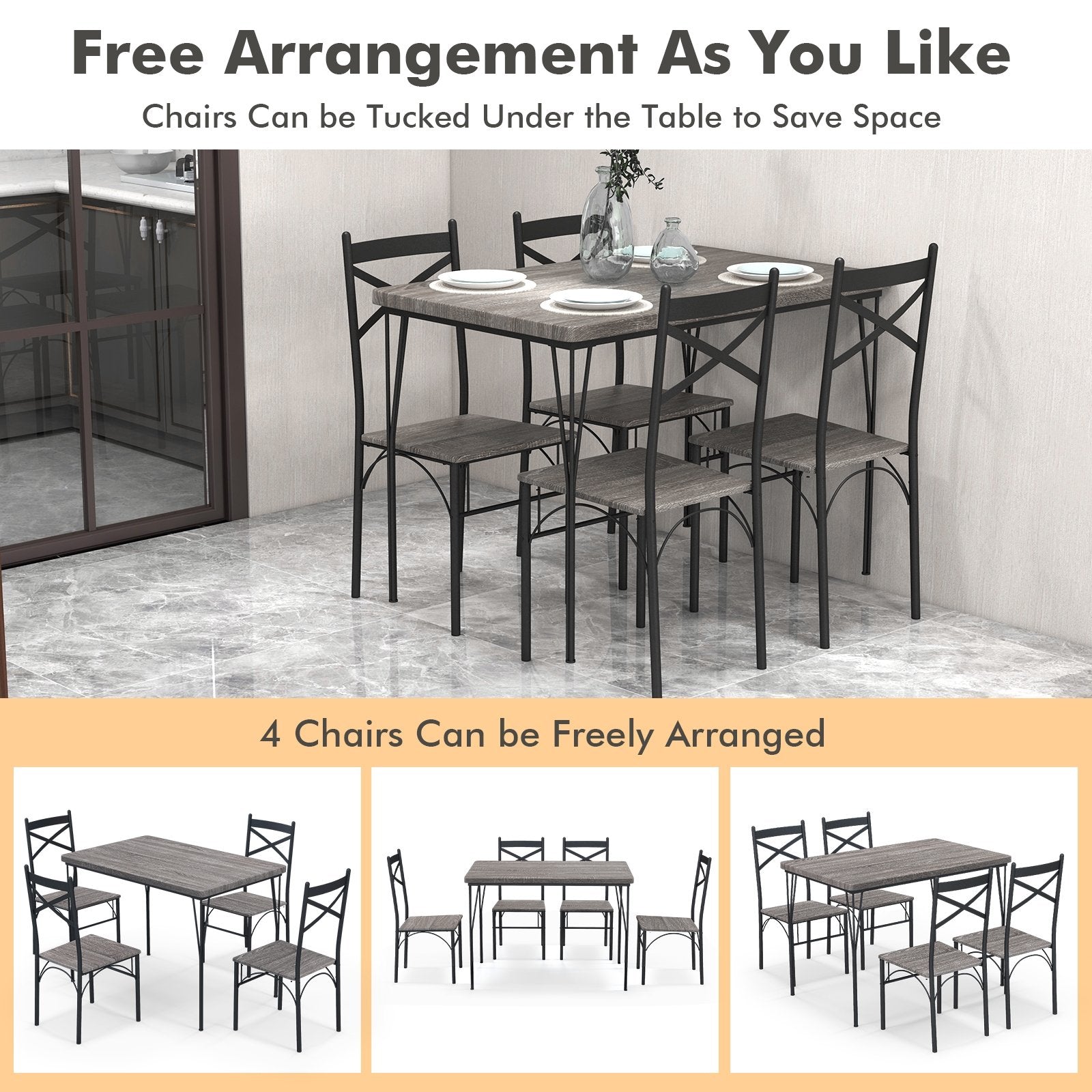 ● 5-Piece Furniture Set: The kitchen dining room furniture set includes a rectangular table and 4 chairs providing the ideal solution for family gatherings and entertaining friends. Besides with its modern appearance and sleek lines the dining set can perfectly blend into any home style.