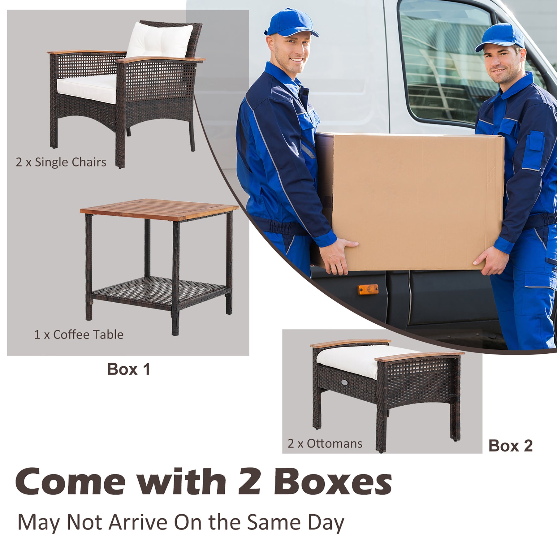 ● Shipped in 2 Boxes: This 5-piece patio furniture set comes with 2 boxes that may not arrive on the same day. The first box includes 1 table with the dimension of 20" x 20" x 20" (L x W x H) 2 single chairs with the dimension of 29.5" x 29" x 31.5" (L x W x H) 2 back cushions 2 seat cushions an all screws. The second box includes 2 ottomans with the dimension of 19" x 29" x 19" (L x W x H) and 2 ottoman cushions.