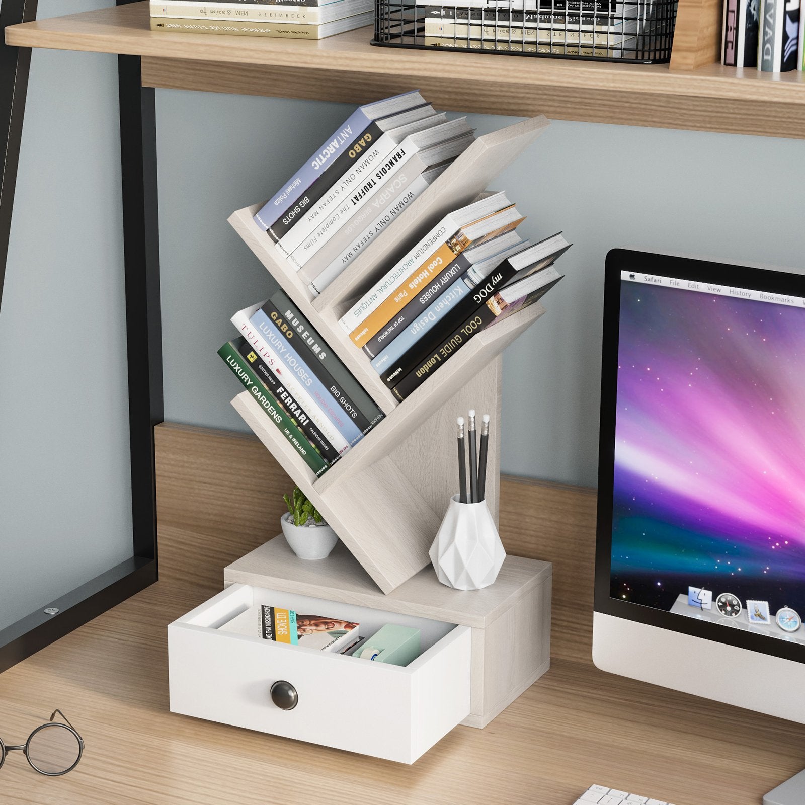 ● Easy and Quick Installation: The assembly of 12" x 7" x 24" (L x W x H) desktop tree shelf is a piece of cake while the whole process takes a short time as well. More conveniently its smooth surface is easy to wipe which means a simple maintenance.