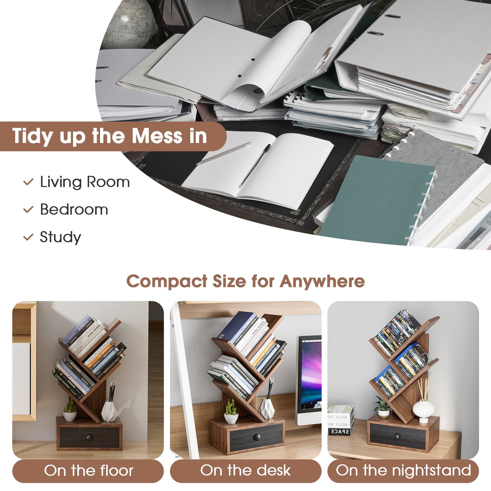 ● Large Storage for Daily Use: The tree bookcase features 5 shelves in total enabling you to fully utilize them for CDs 5-10 books magazines and decorations. Besides there is also a 9" x 5" x 3" (L x W x H) drawer at the bottom designed for private storage. Thus it's an ideal place to accommodate your keys and wallets.