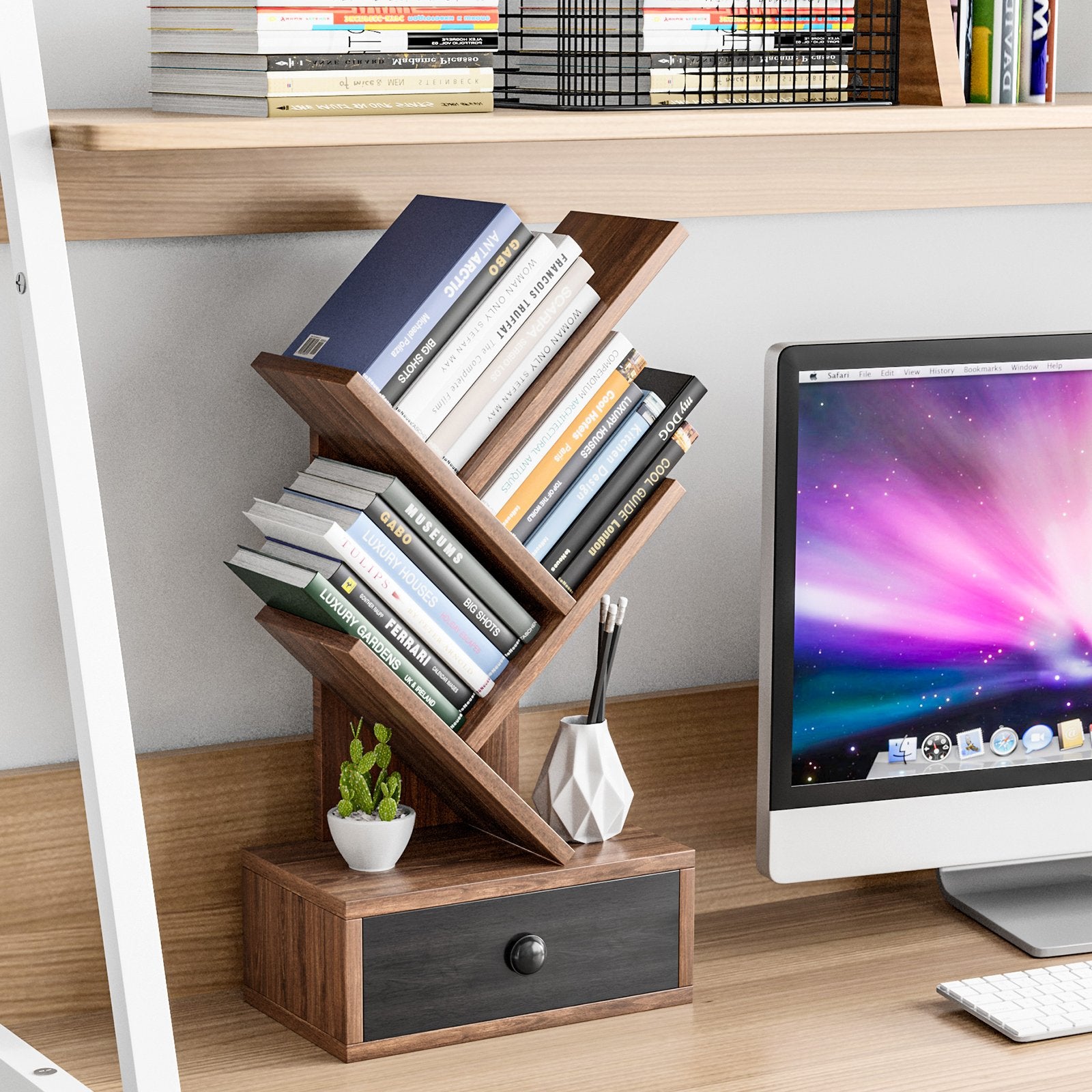 ● Easy and Quick Installation: The assembly of 12" x 7" x 24" (L x W x H) desktop tree shelf is a piece of cake while the whole process takes a short time as well. More conveniently its smooth surface is easy to wipe which means a simple maintenance.