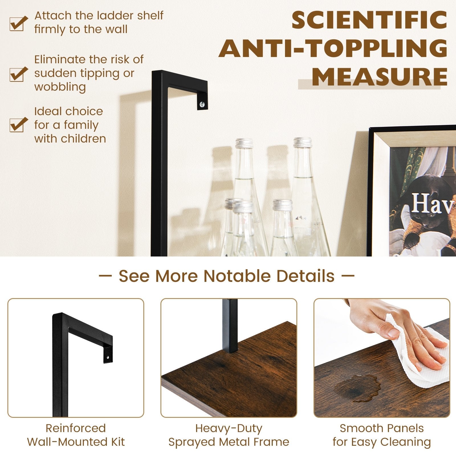 ● Safe Wall-Mounted Design: Unlike traditional bookshelves the ladder shelf features a scientific fixation kit enabling you to easily attach it tightly to the wall. Thus the potential risk of tipping or wobbling will be highly eliminated. Besides using safety even on uneven floor is also well ensured since it is stably supported by the wall.
