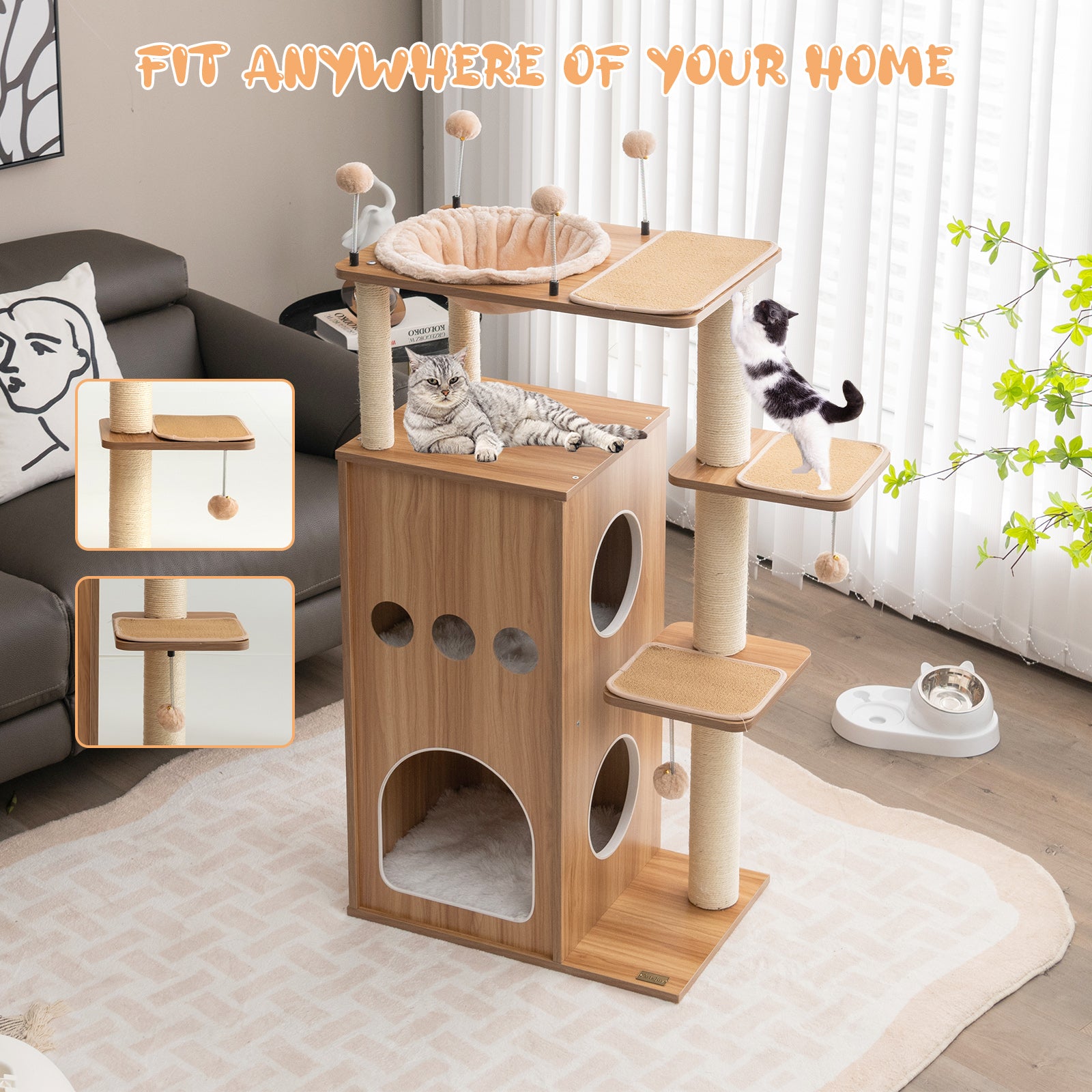 ● Safe and Robust Construction: The widened engineered wood base provides greater support for the cat climbing tree and both the cat house and platform can hold up to 44 lbs making it suitable for most sizes of cats. In addition to upgrade the stability of the cat tree tower the base is equipped with 6 non-slip pads to prevent tilting and tipping.