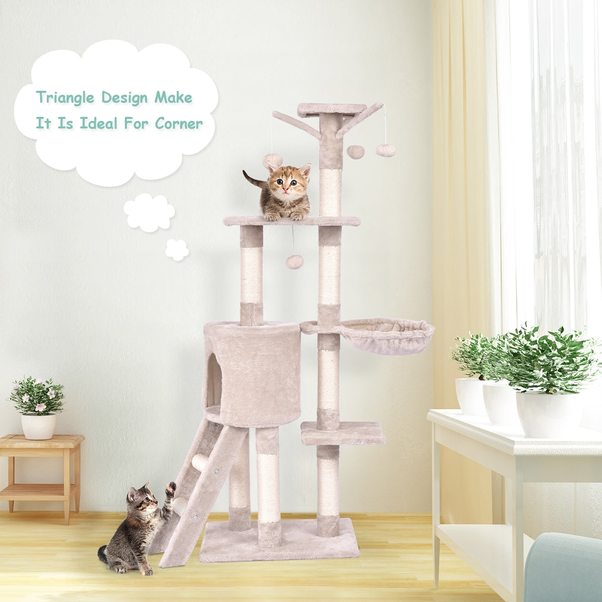 ● Beautifully Designed With Fun Activities: With two platform one hammock and one room this cat tower is perfect for your cat to scratch climb jump play and even to sleep or lounge on.