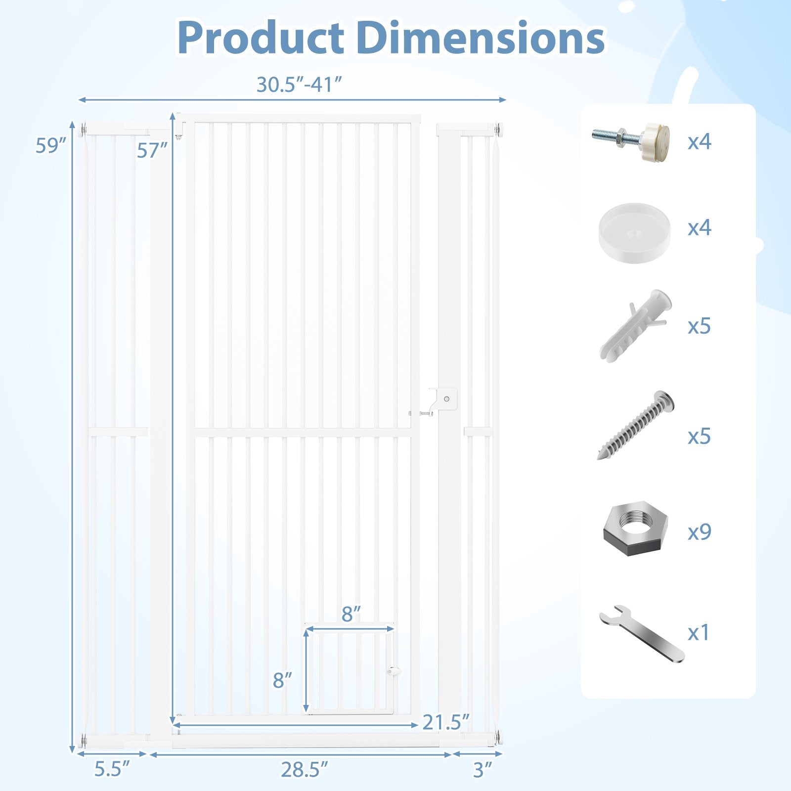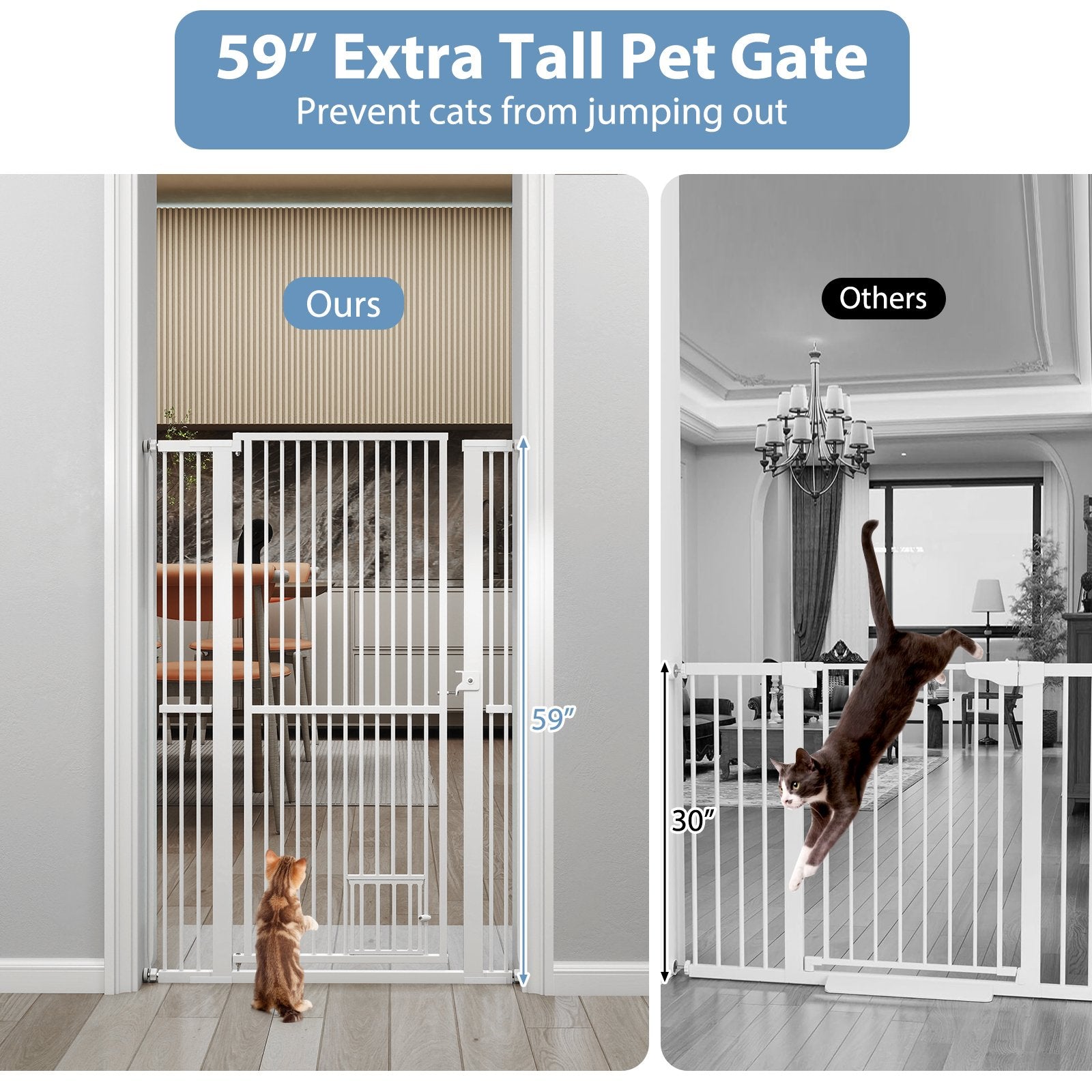 ● Extra Tall Design: In contrast to normal 30" tall pet gates this pet gate stands at a remarkable height of 59" making it an ideal choice for larger pets or those fond of jumping ensuring their safety and your peace of mind.