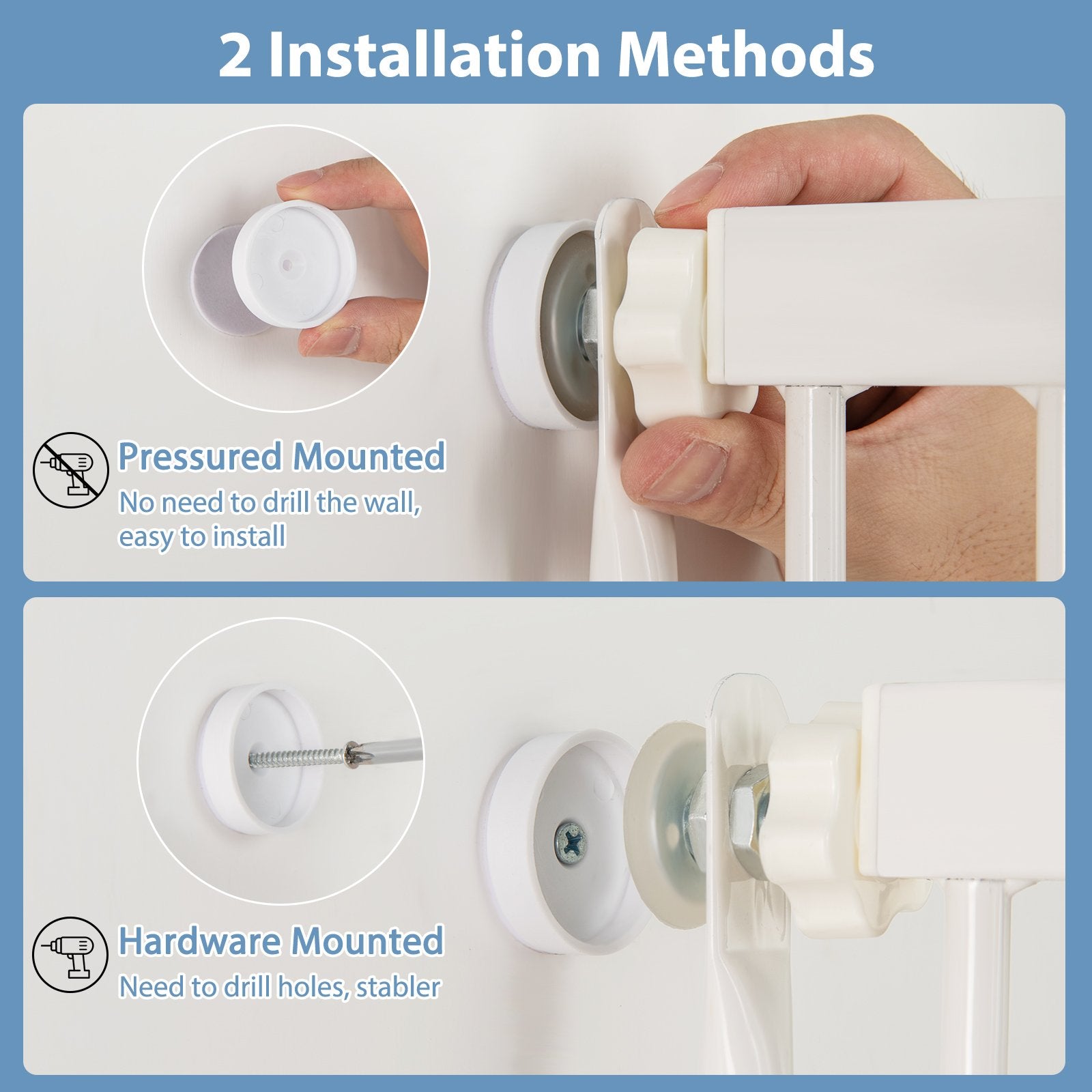 ● 2 Installation Methods: The dog gate is equipped with 4 adjustable pressure mounted kits for a no-drill installation perfect for temporary or semi-permanent setups. Alternatively for more permanent and stable solutions hardware mounted kits are also provided. Warm Tips: Please do not cut off the zip ties until the installation is finished.