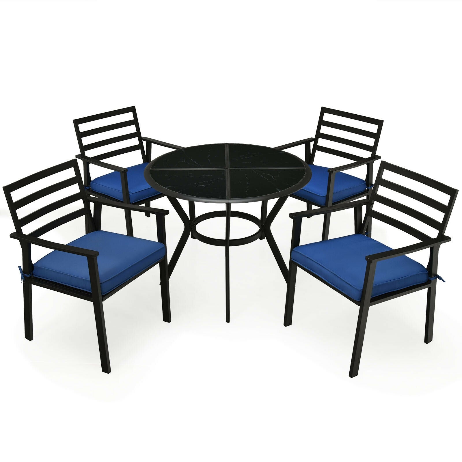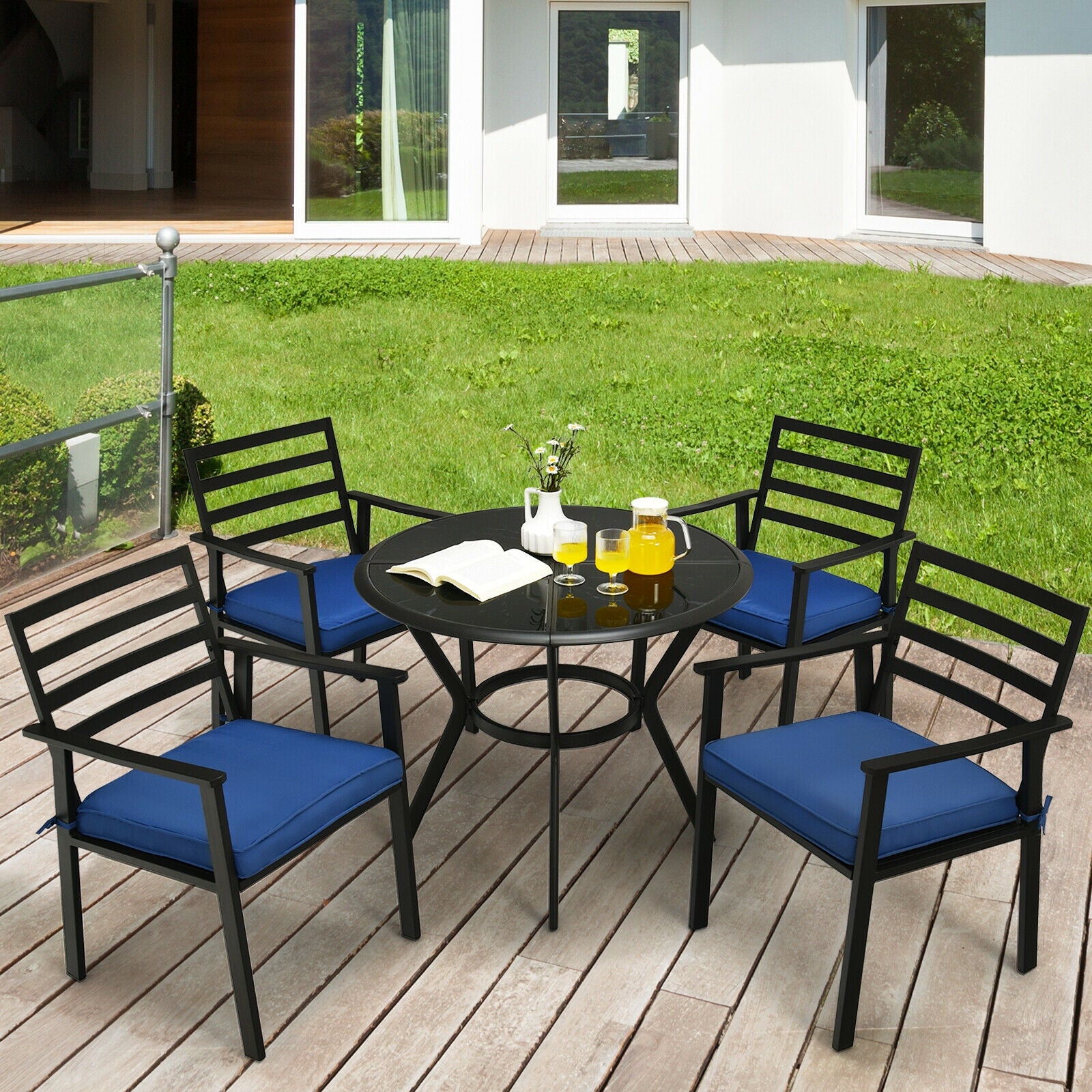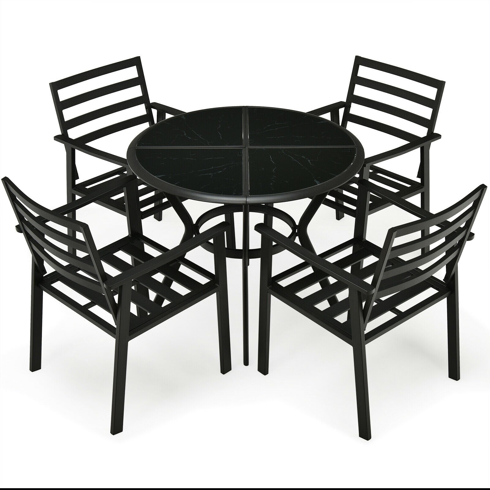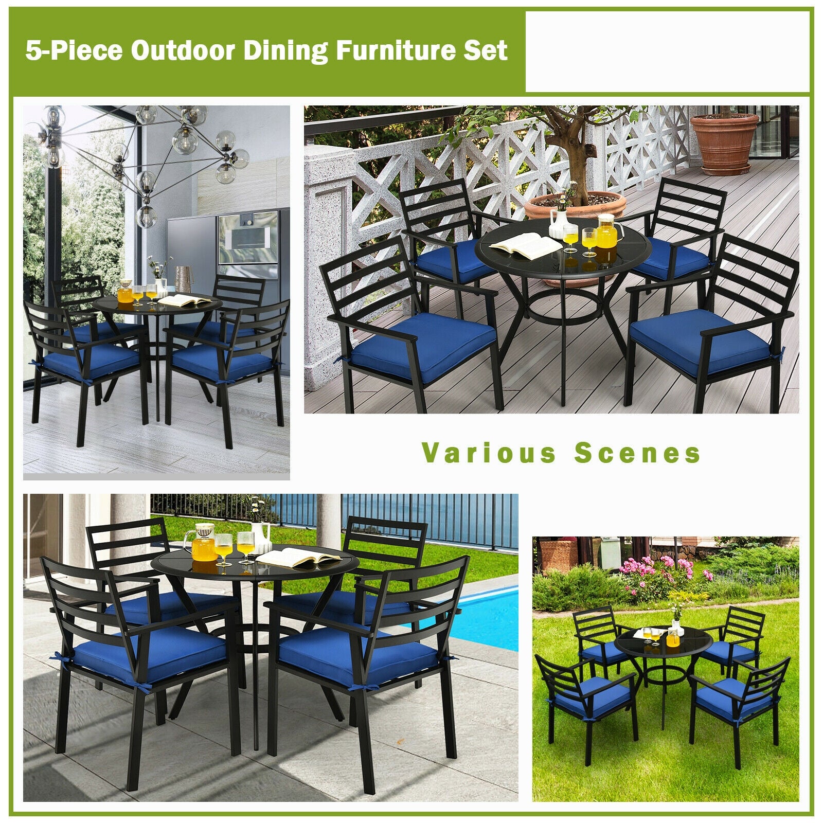 ● 5-Piece Outdoor Dining Furniture: This outdoor iron dining set includes 4 armchairs and a glass dining table. Whether chatting with friends in the garden on a sunny day or eating food with family in the courtyard in the evening this dining table and chair set can bring you the ultimate experience.