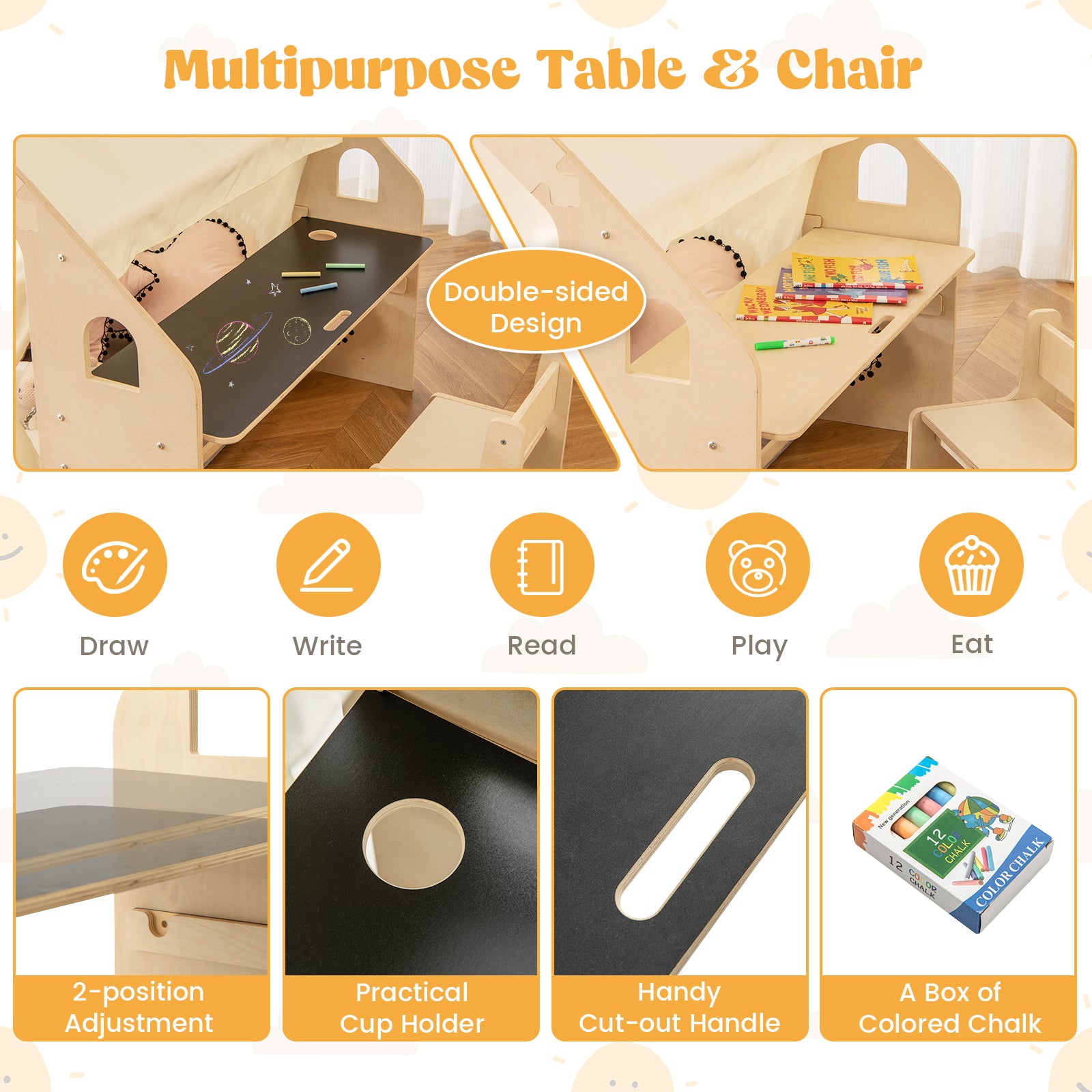 ● Multipurpose Table and Chair: With a double-sided design the blackboard with chalks easily converts into a table and chair set allowing toddlers to draw write read play or eat. And the 2-position adjustment adapts to children of different heights. Moreover the practical cup holder and handy cut-out handle bring great convenience.
