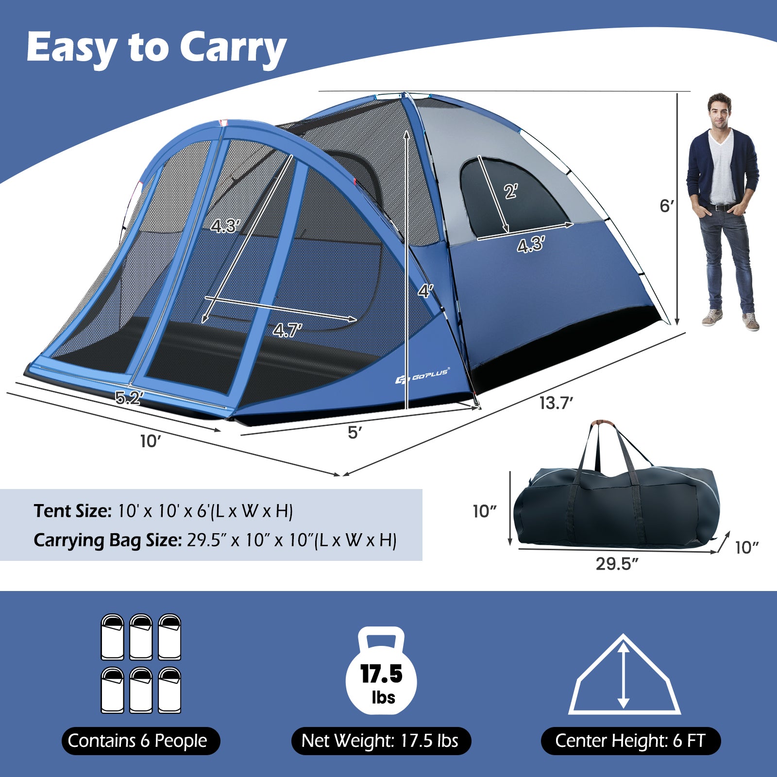 ● Roomy Space and Large Screen Room: The large camping dome tent measures 10' x 10' x 6'(L x W x H) providing roomy space for 6 persons to rest and play. Especially it is designed with an extra-large screen room porch which allows you to store backpacks hiking boots and other camping gear or put chairs and table for resting and enjoying the outdoor scenery.