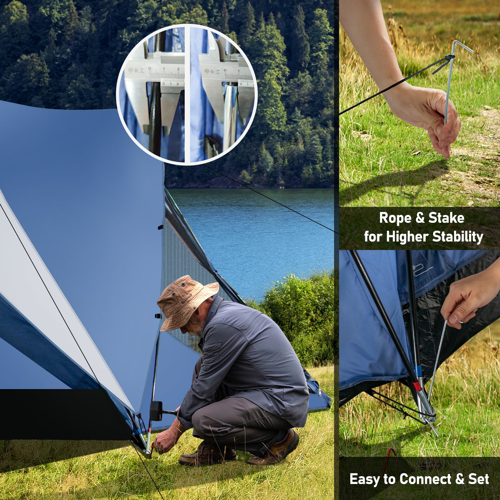● Excellent Windproof Performance: The camping tent is equipped with fixed buckles and stakes fixation wind ropes and stakes fixation and window awnings to increase wind resistance ensuring more stability in windy conditions. Besides instead of using 7 mm brittle normal rods our tent adopts 9.5 mm and 11 mm thickened fiberglass rods.